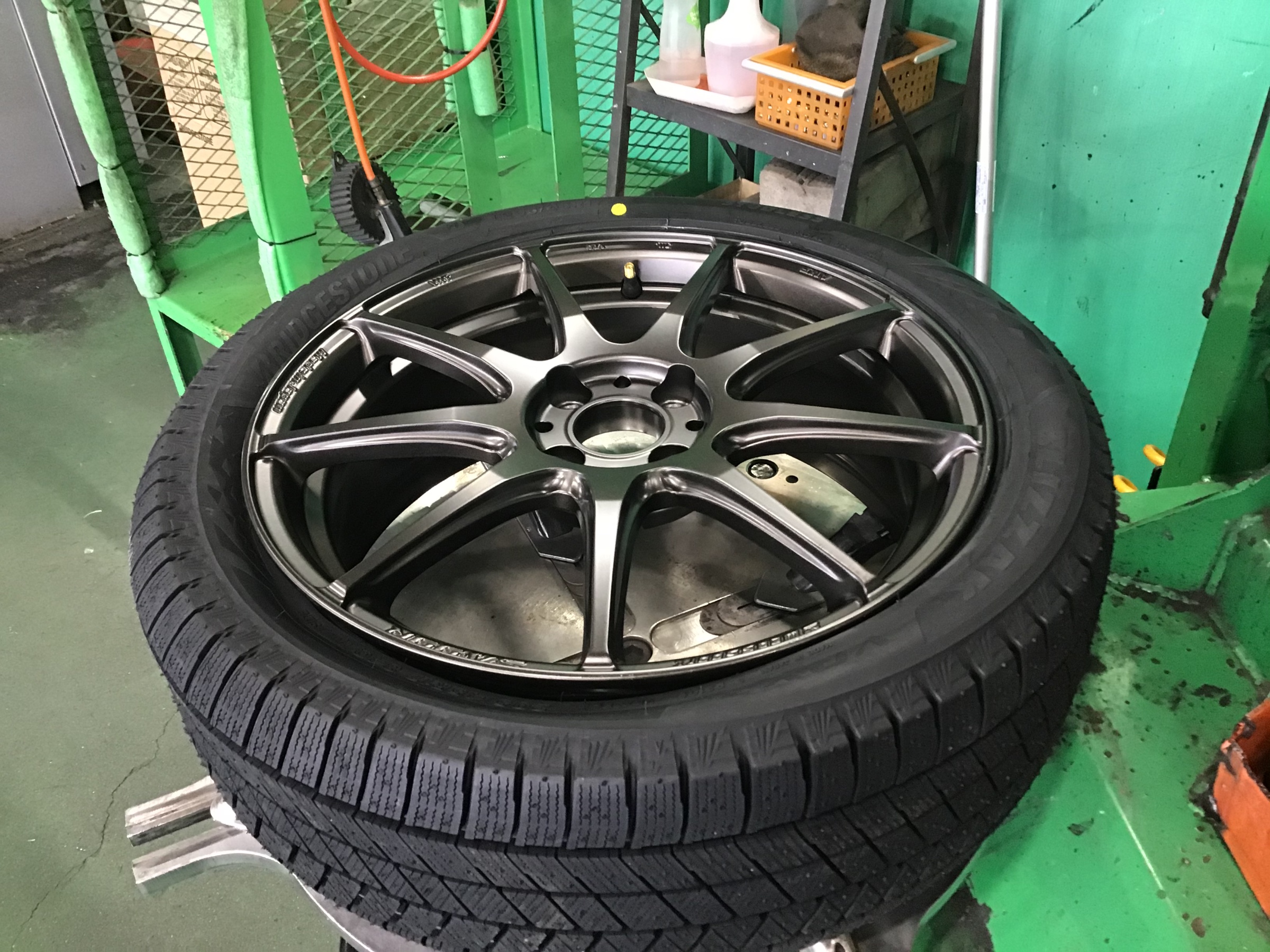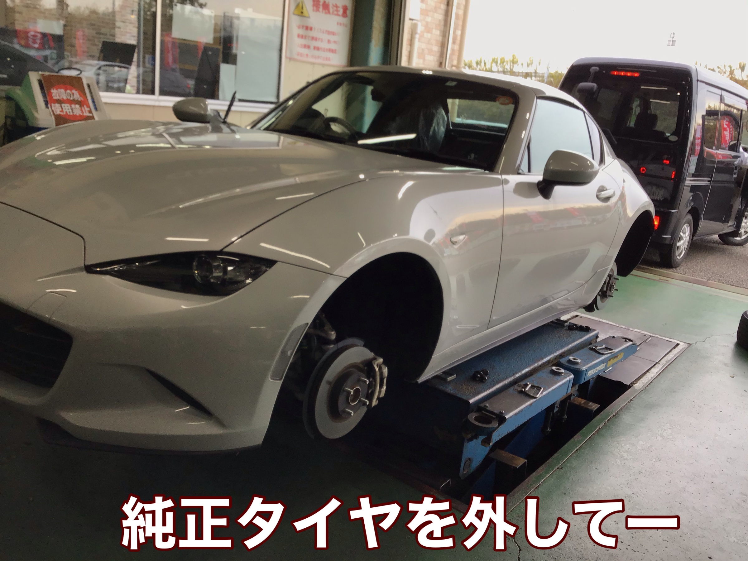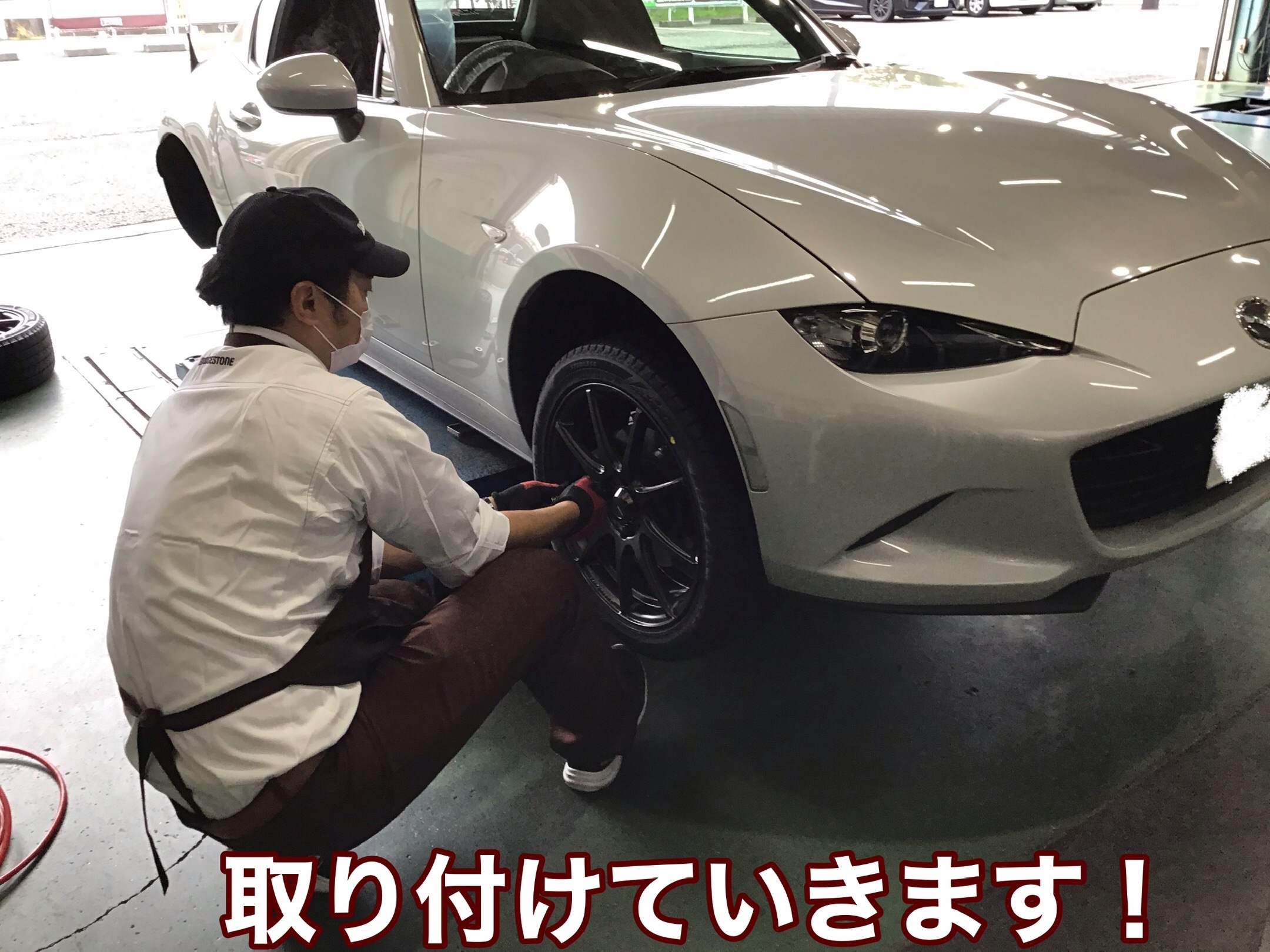 外したら、予めセットしておいた冬タイヤを付けていきます
