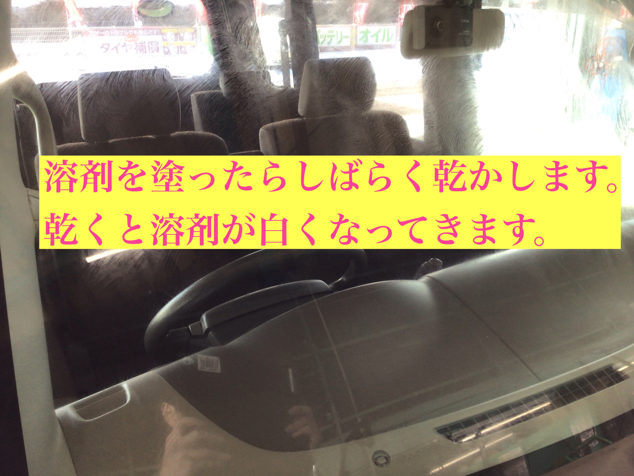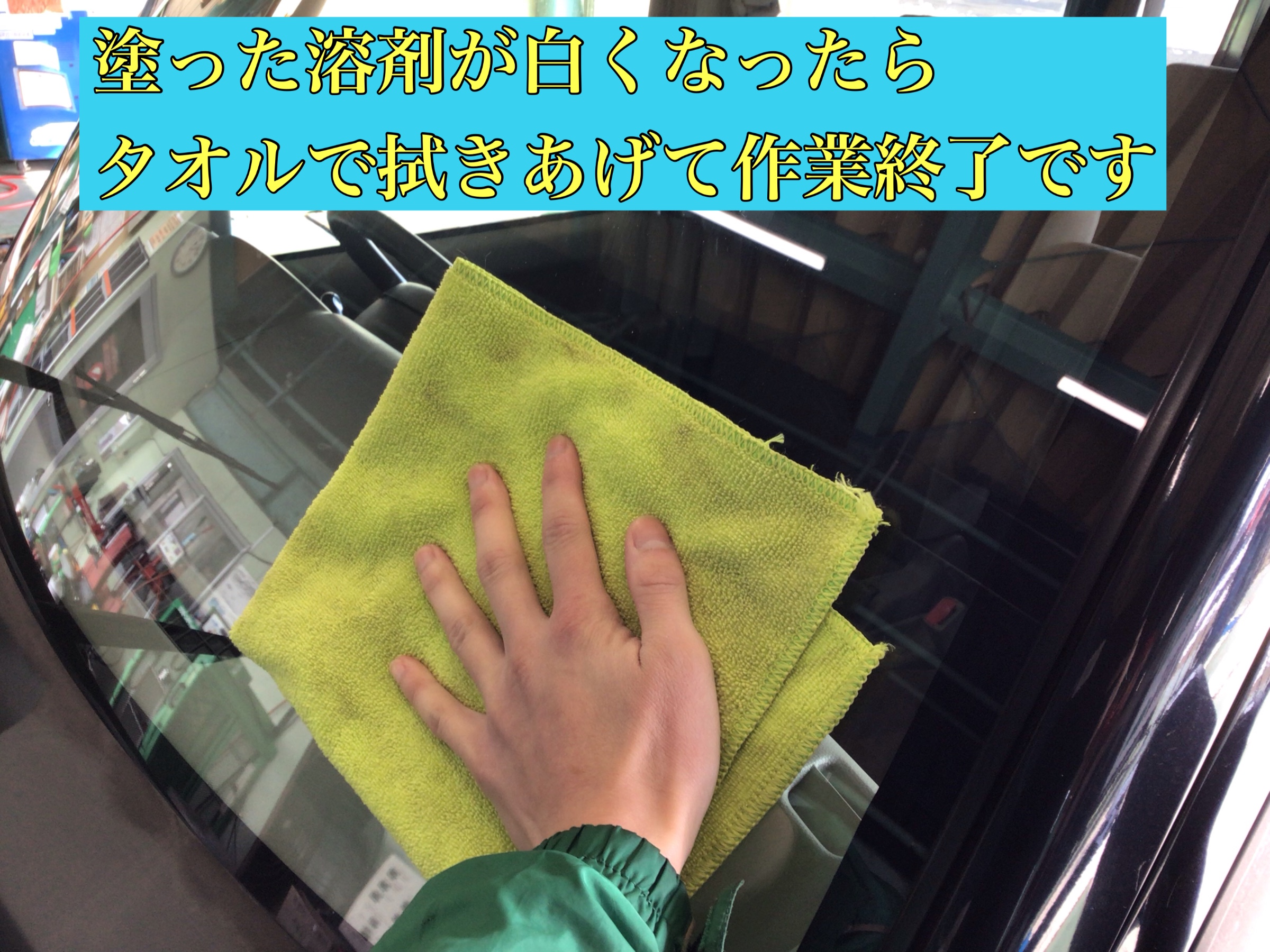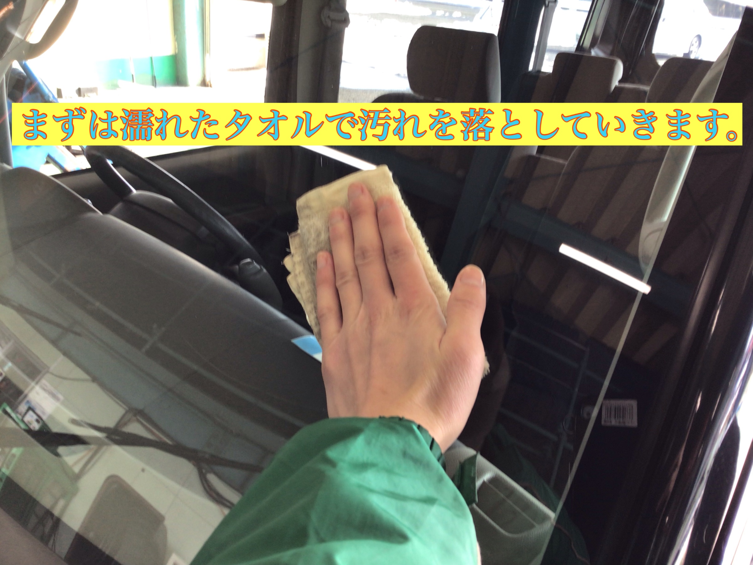 最初にフロントガラスに付着した汚れを濡れたタオルで拭きあげます。