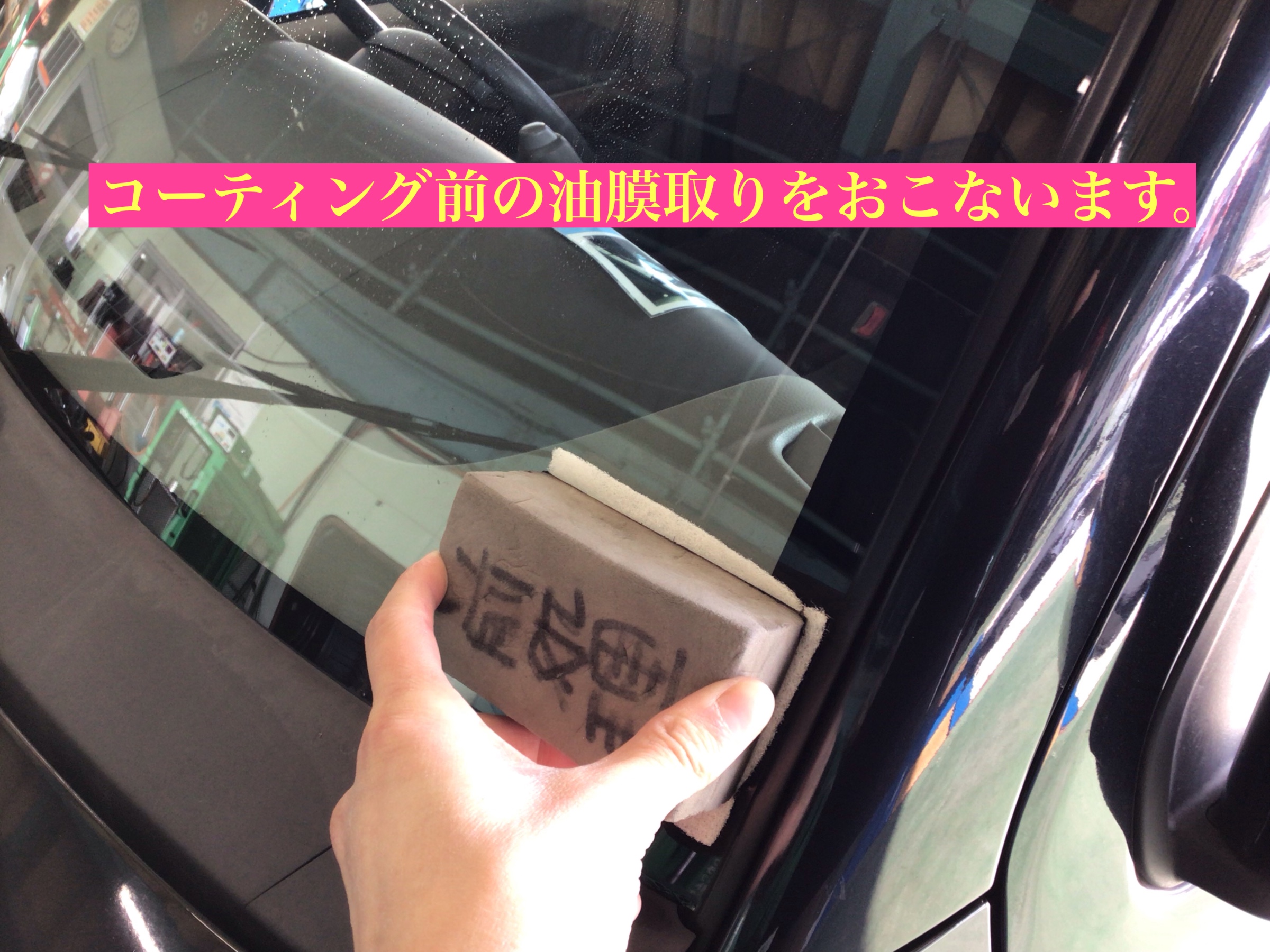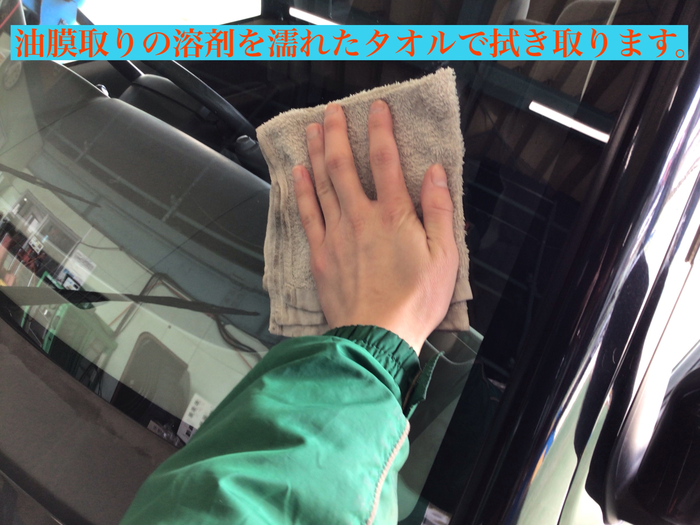 拭き上げ後、撥水する様に下準備で油膜取りをおこないます。