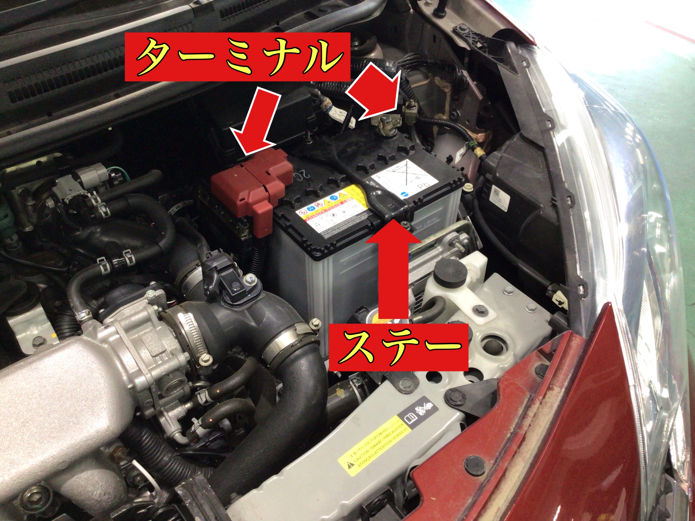 では古いバッテリーを外すのでターミナルと取付ステーを外します。