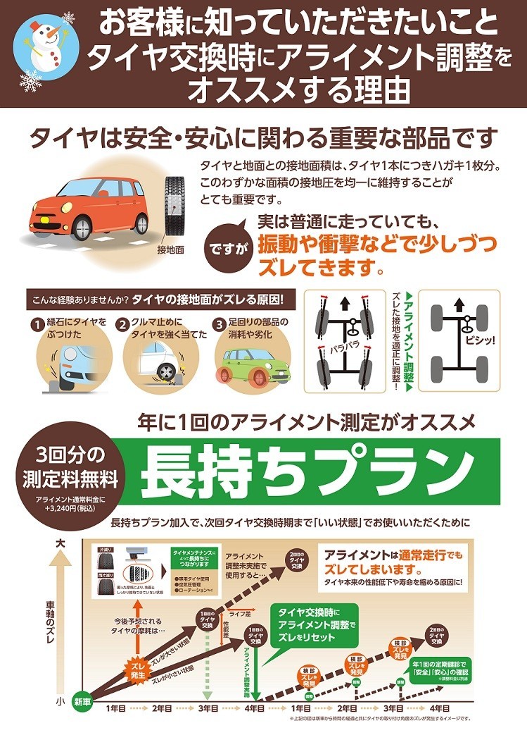 通常¥14,300のアライメント測定料が4年間で4回分無料でお得です!!