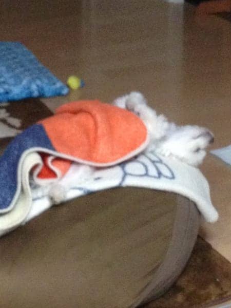 毛布をかぶって寝返りをして仰向けの所です。