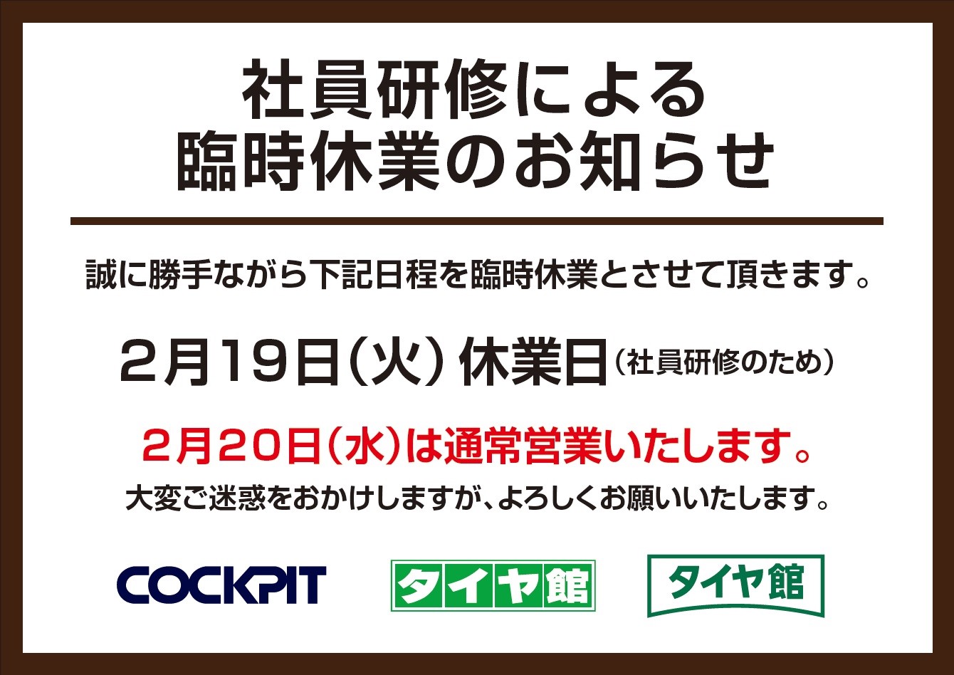 2月19日(火)は社員研修のため臨時休業となります。