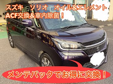 ホームページをご覧頂き ありがとうございます(´ー`) 本日ご紹介するのは スズキ ソリオ オイル+エレメント交換 ACF交換、車内除菌・消臭 です! それではどうぞ! 本日の交換はメンテナンスパックをご使用いただいての交換作業となりました! 今回はオイル・脱着プランをご契約いただき、セレク...