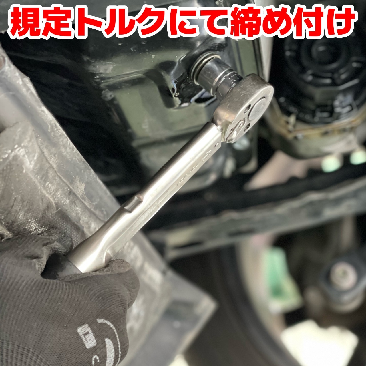 ドレンボルトのパッキンを交換し、フィルターも新しく!メーカーが定める規定トルクにて締め付けていきます。締めすぎは要注意ですよ!