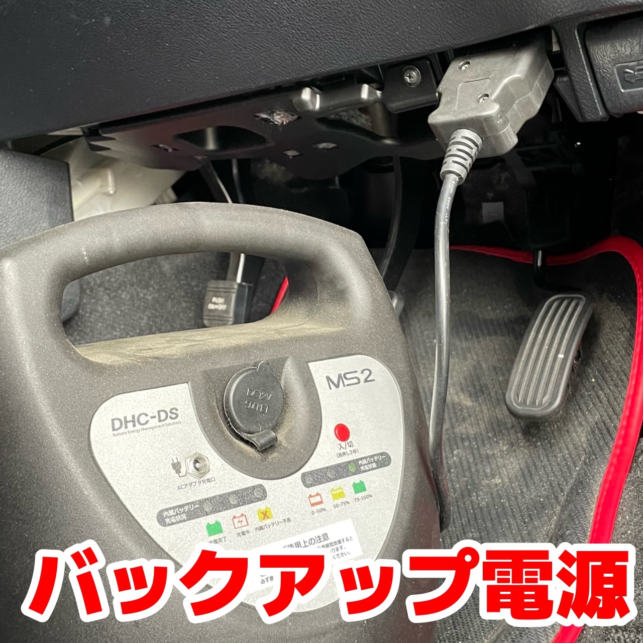 バッテリーの交換中、ターミナル端子を外すので、ナビの設定やオートウインドウ設定が飛ばないよう、バックアップ電源を接続し電源が遮断されないようにします。