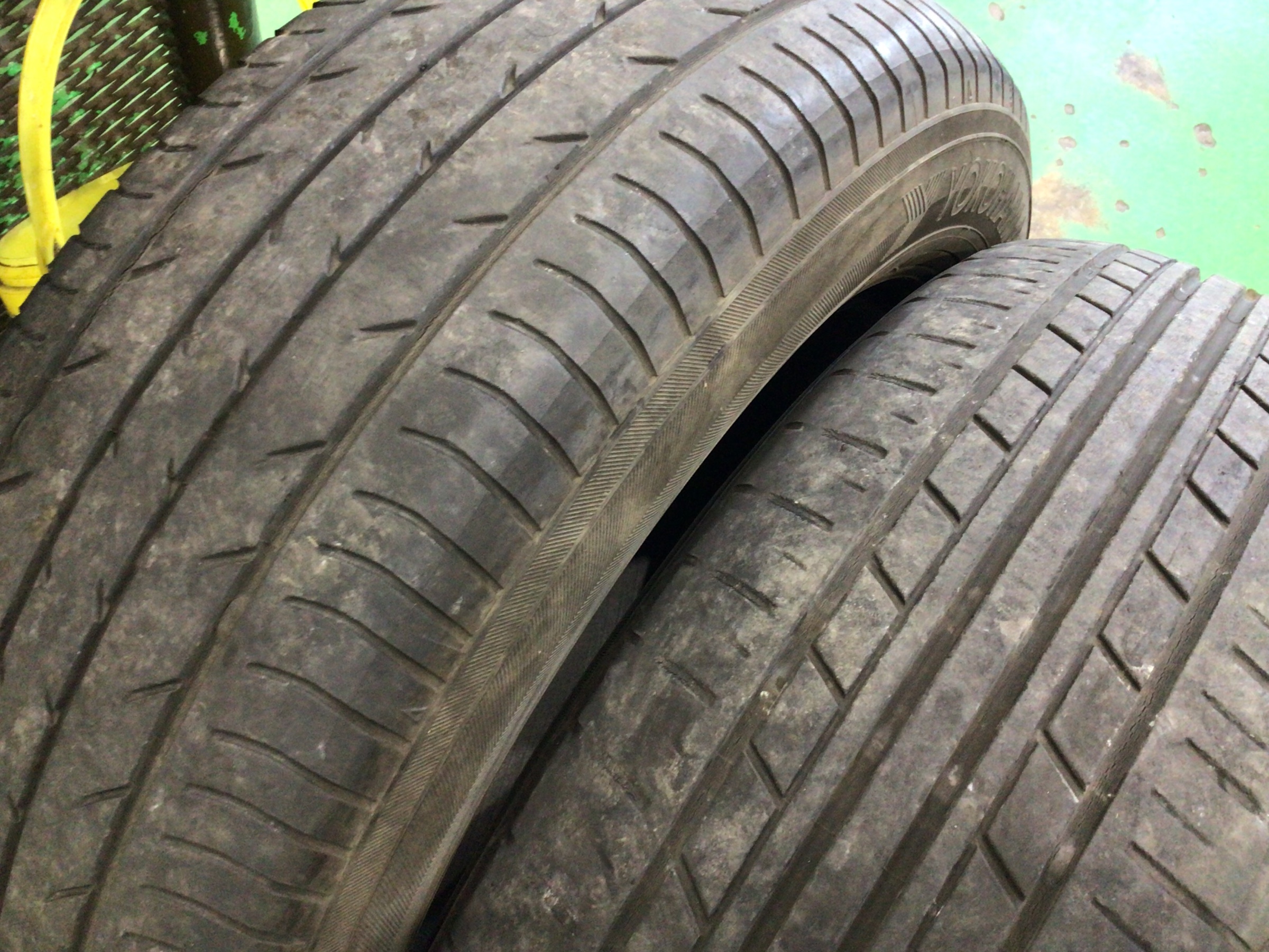 これまで装着されていたタイヤです。摩耗とひび割れが進んでいますね。車検は通るかどうか微妙なところです。