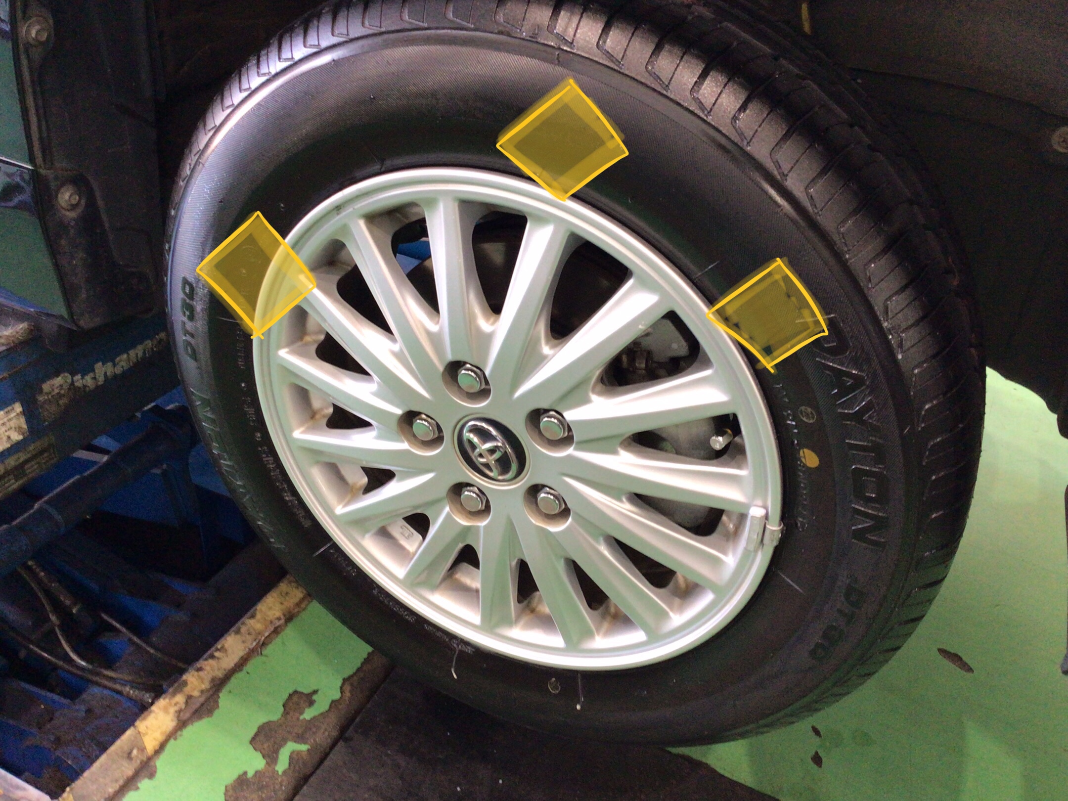 新品装着。両面打ち込みウェイトが渋いですね。本日はありがとうございました。100キロ点検でお待ちしております。ノアのタイヤ交換はタイヤ館新座で!