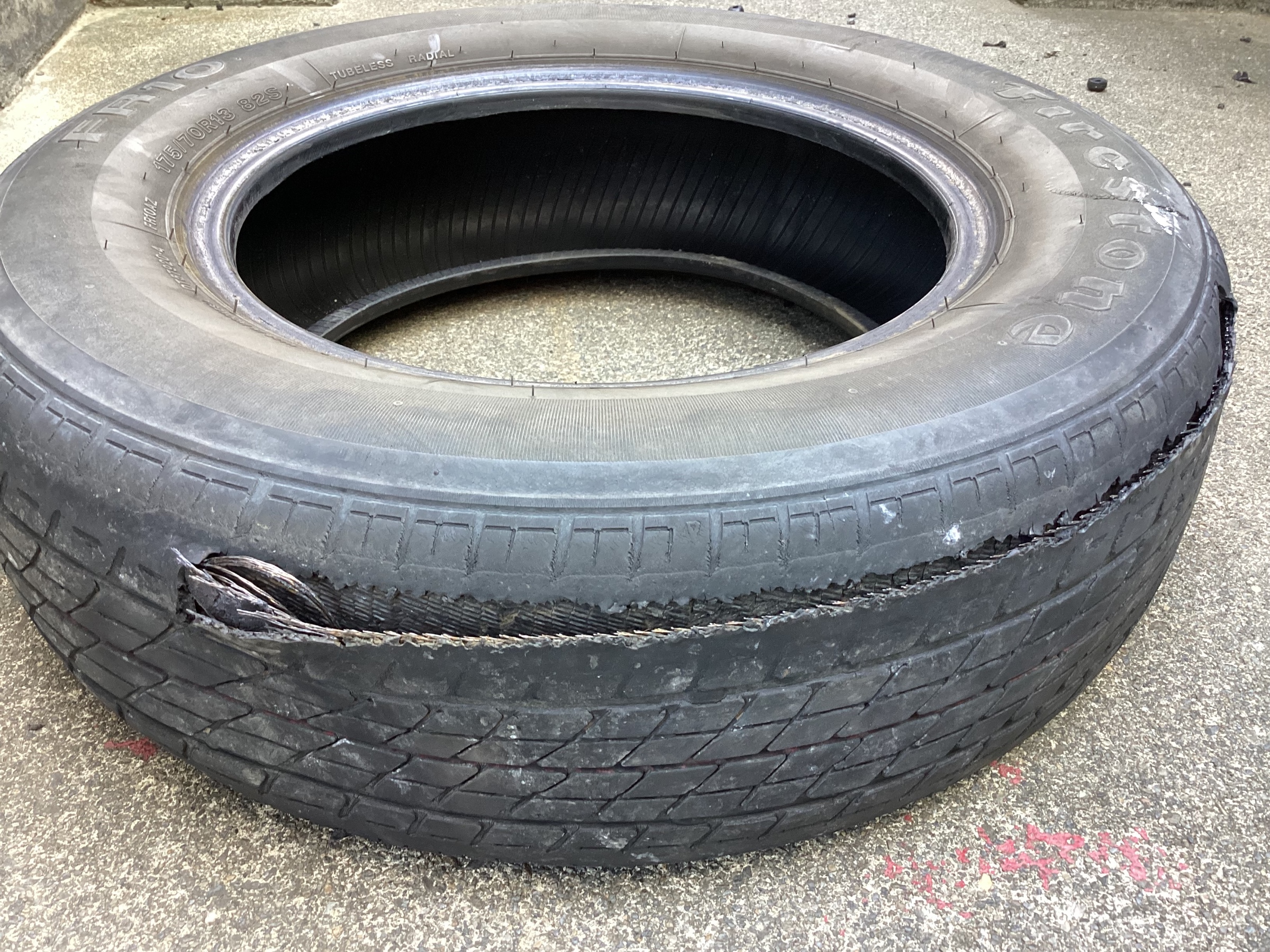 これまで装着されていたタイヤです。1本バースト寸前の状態にまでなっていて非常に危険な状態で即交換が必要な状態でした。