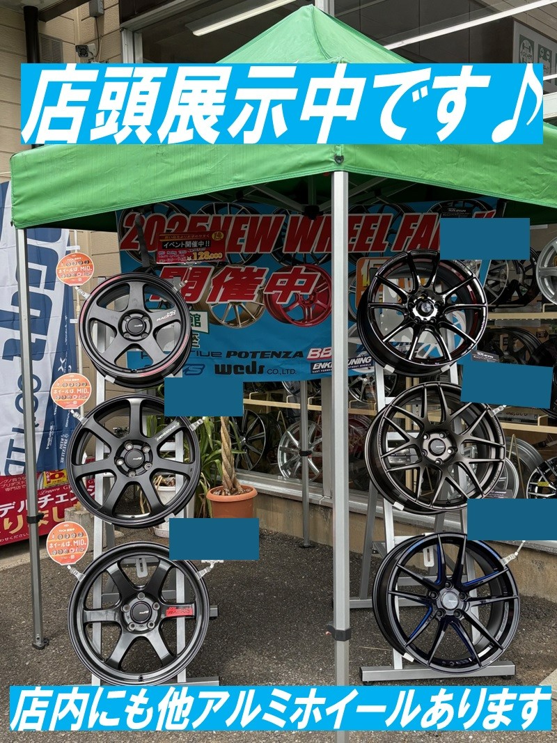 展示ホイールはブリヂストンのアルミホイールやジャパン三陽様・WEDS様・マルカサービス様より