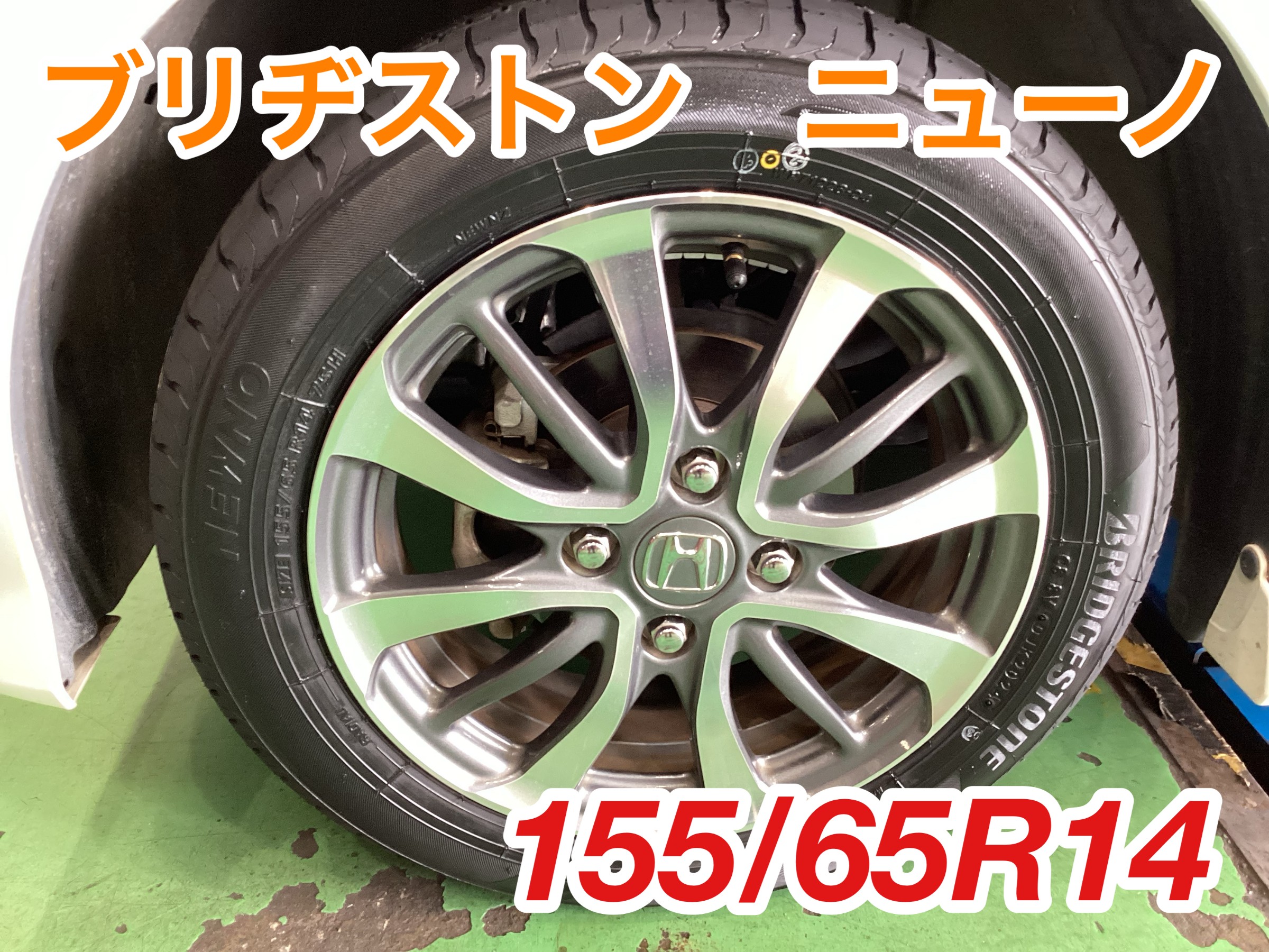 今回装着したタイヤはブリヂストンニューノ、タイヤサイズは155/65R14です。