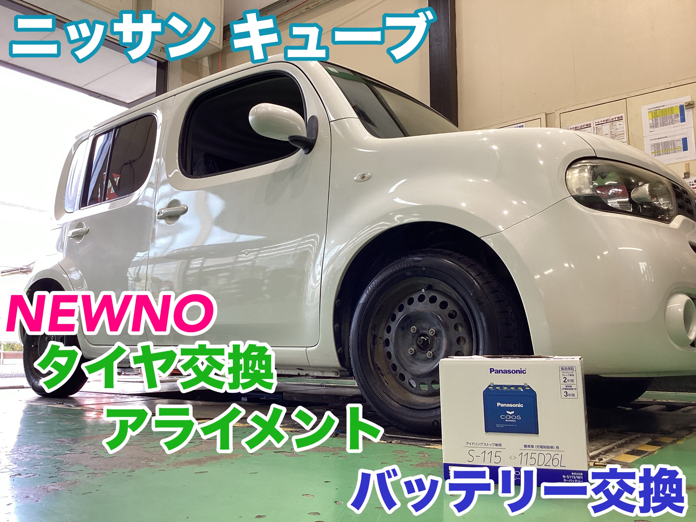 ☆ニッサン キューブ NEWNO タイヤ交換、アライメント、バッテリー交換☆