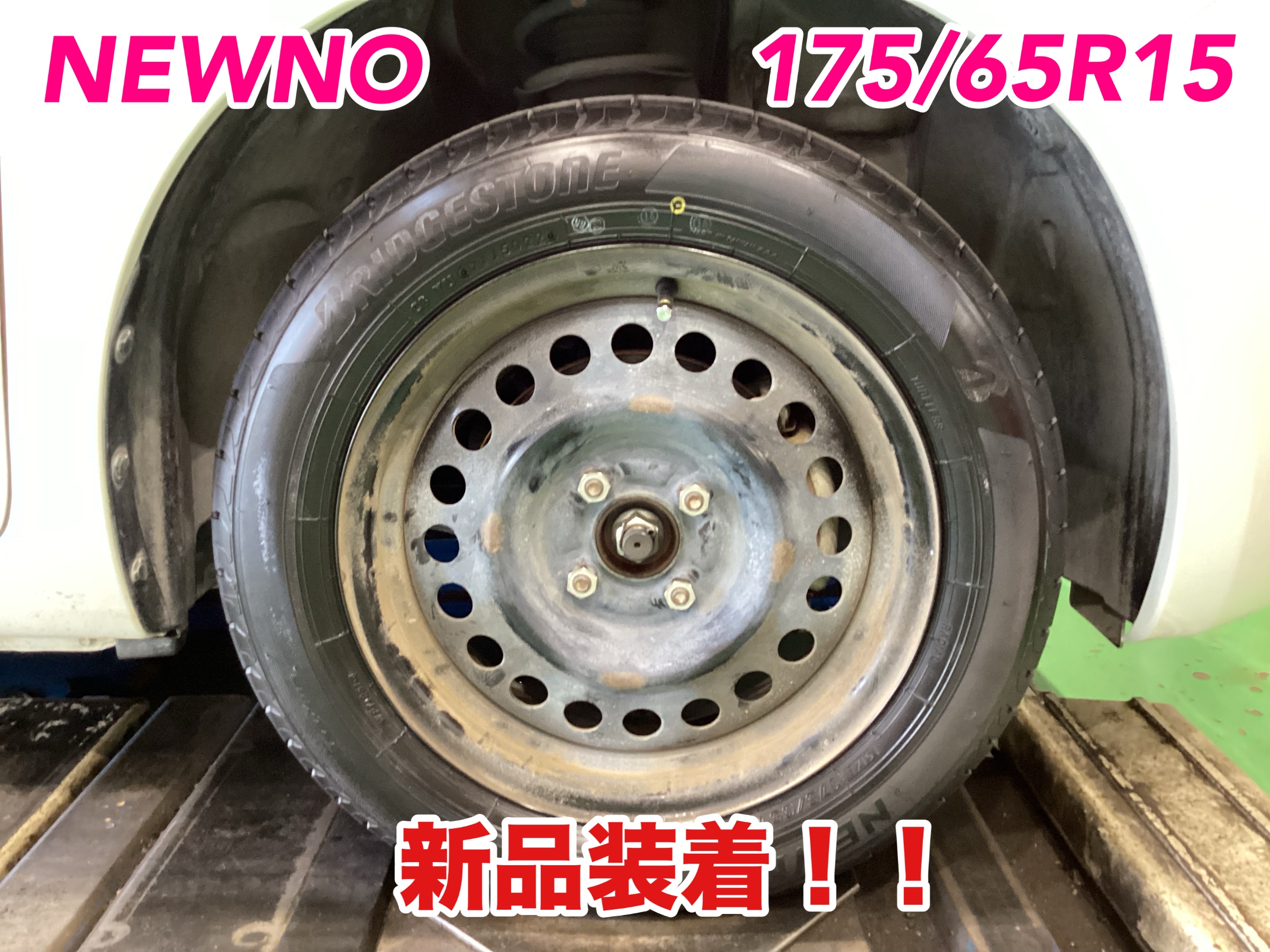 今回装着したタイヤはブリヂストンニューノ、タイヤサイズは175/65R15です。