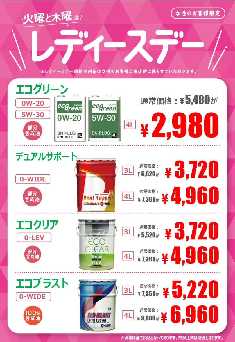 レディースデーではエンジンオイルがお得に交換できます♪