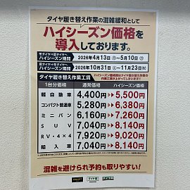 早くもタイヤ交換のご予約頂きありがとうございます(*^^)v 今年は雪も少なく、タイヤ交換のご予約が 早くも入ってきてますので、お早めにご相談ください♪ 本題のハイシーズン価格の日程が出ました!! ハイシーズン期間は通常より1,100円高くなってしまうので ご予約の際にはお気をつけて頂ければ...