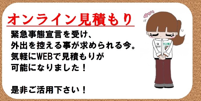 オンラインお見積り出来ます! ポスト 2021年2月15日 お電話でのお見積りに次いで、 オンライン見積もりも出来るようになりました! コロナ禍で、外出を控える事が求められる中 気軽にWEBでのお見積りも承っています。 是非ご利用下さいませ。 関連情報もあわせてご覧ください WEB見積もり カテゴリ:お知らせ