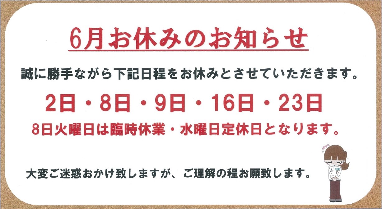 6月のお休みのお知らせです。 ポスト 2021年6月1日 当店WEBをご覧くださりありがとうございます。 6月のお休みのお知らせです。 ≪定休日:水曜日≫ 6/2(水) 8(火)※(臨時休業になります) 9(水) 16(水) 23(水) 8日(火)は臨時休業とさせて頂きます。ご注意ください。 愛車のメンテナンスしませんか? 無料安全点検実施中★!(^^)! 愛車も労わってあげてください♪ 当店で「ちゃんと買い」一緒にしませんか? お出かけ前に、タイヤ館西船橋! お気軽にご来店下さい(^^)/ カテゴリ:お知らせ