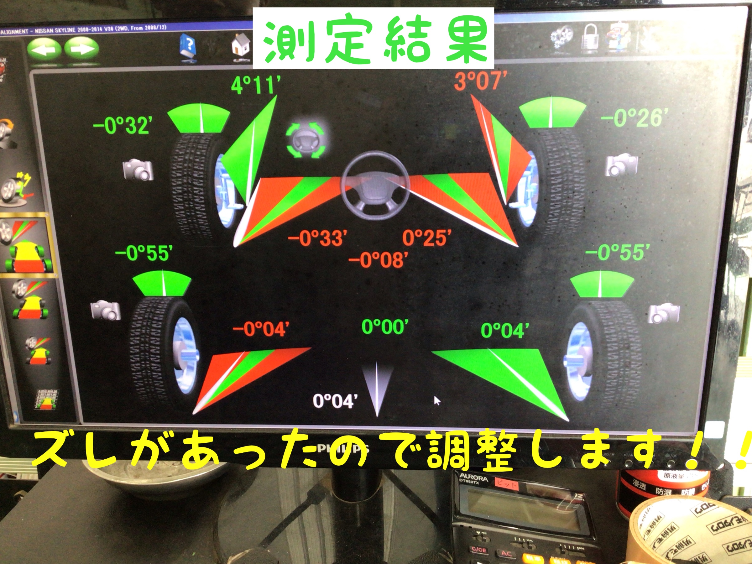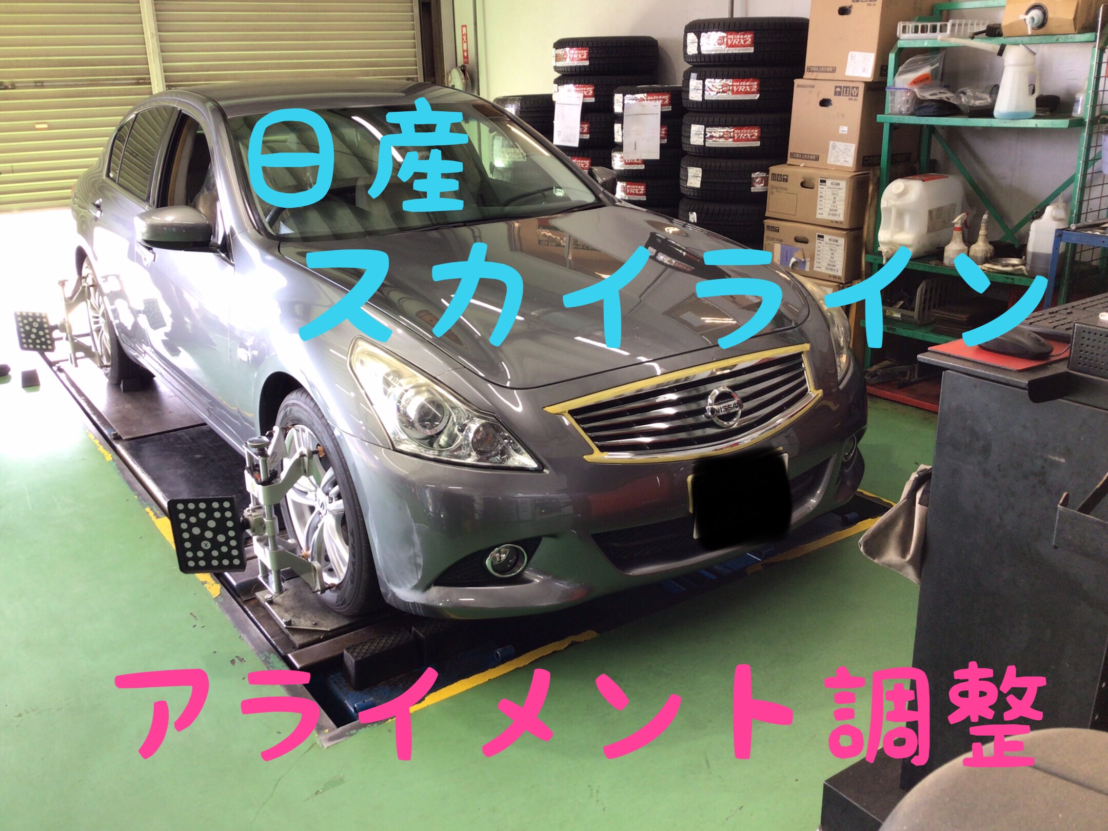 日産 スカイラインのアライメント作業です。