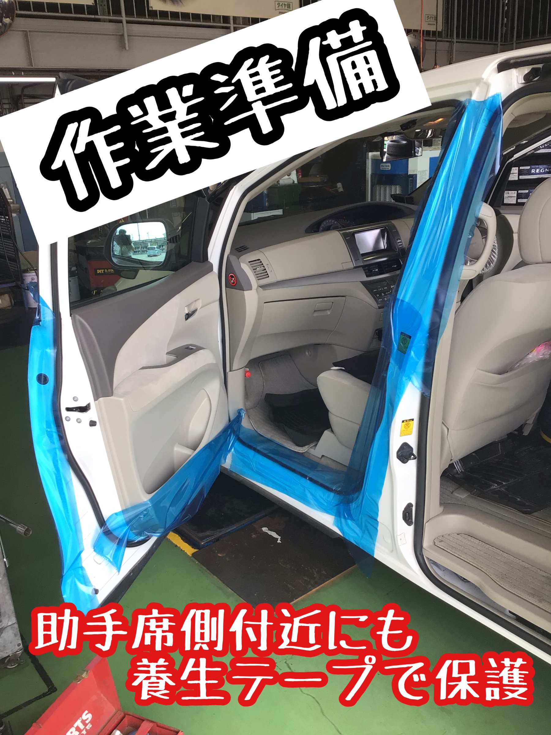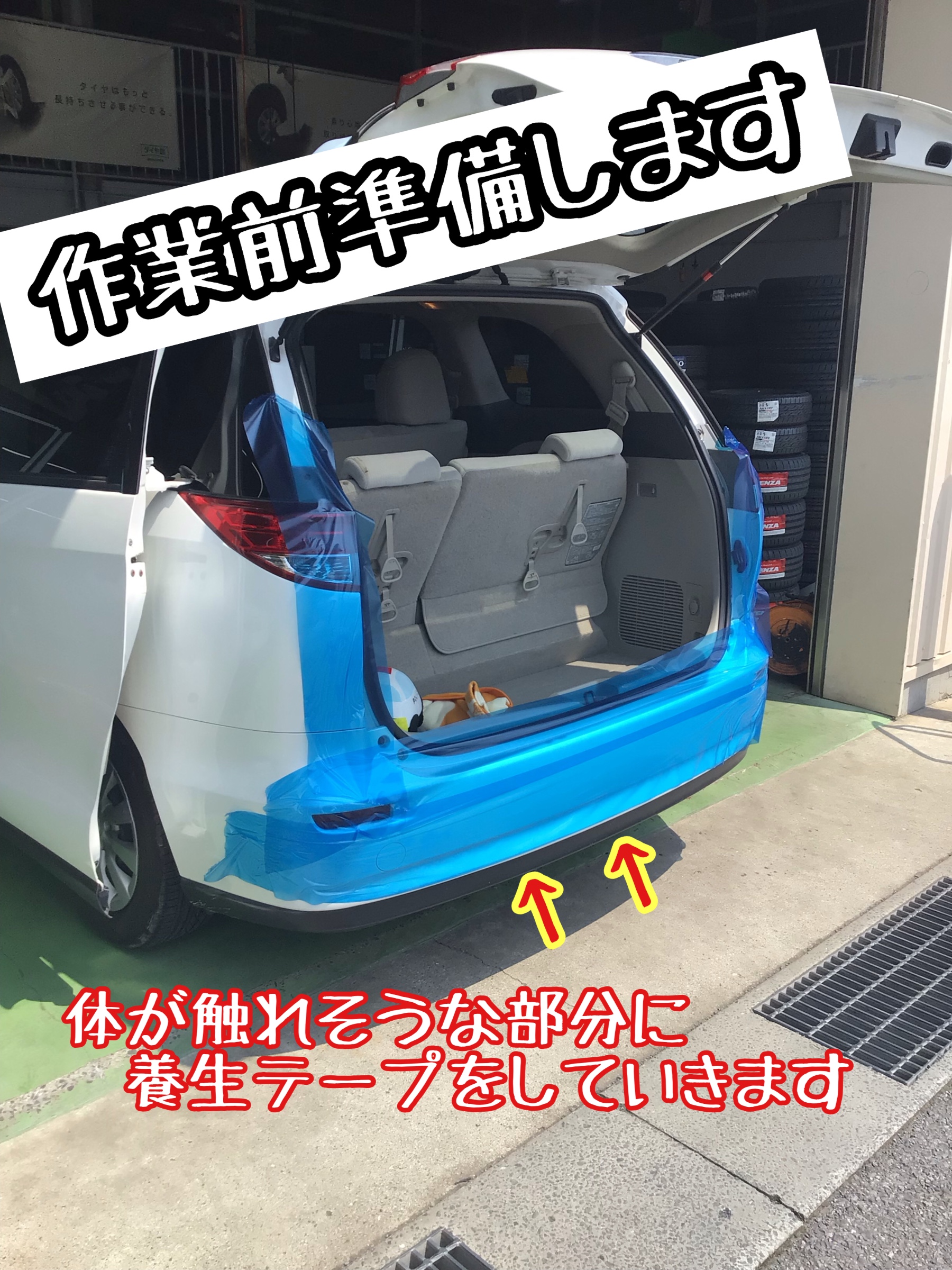 事前に身体が触れそうな部分に養生テープで