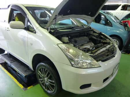 本日はトヨタのウィッシュ。フロントにスペアタイヤ装着でご来店。