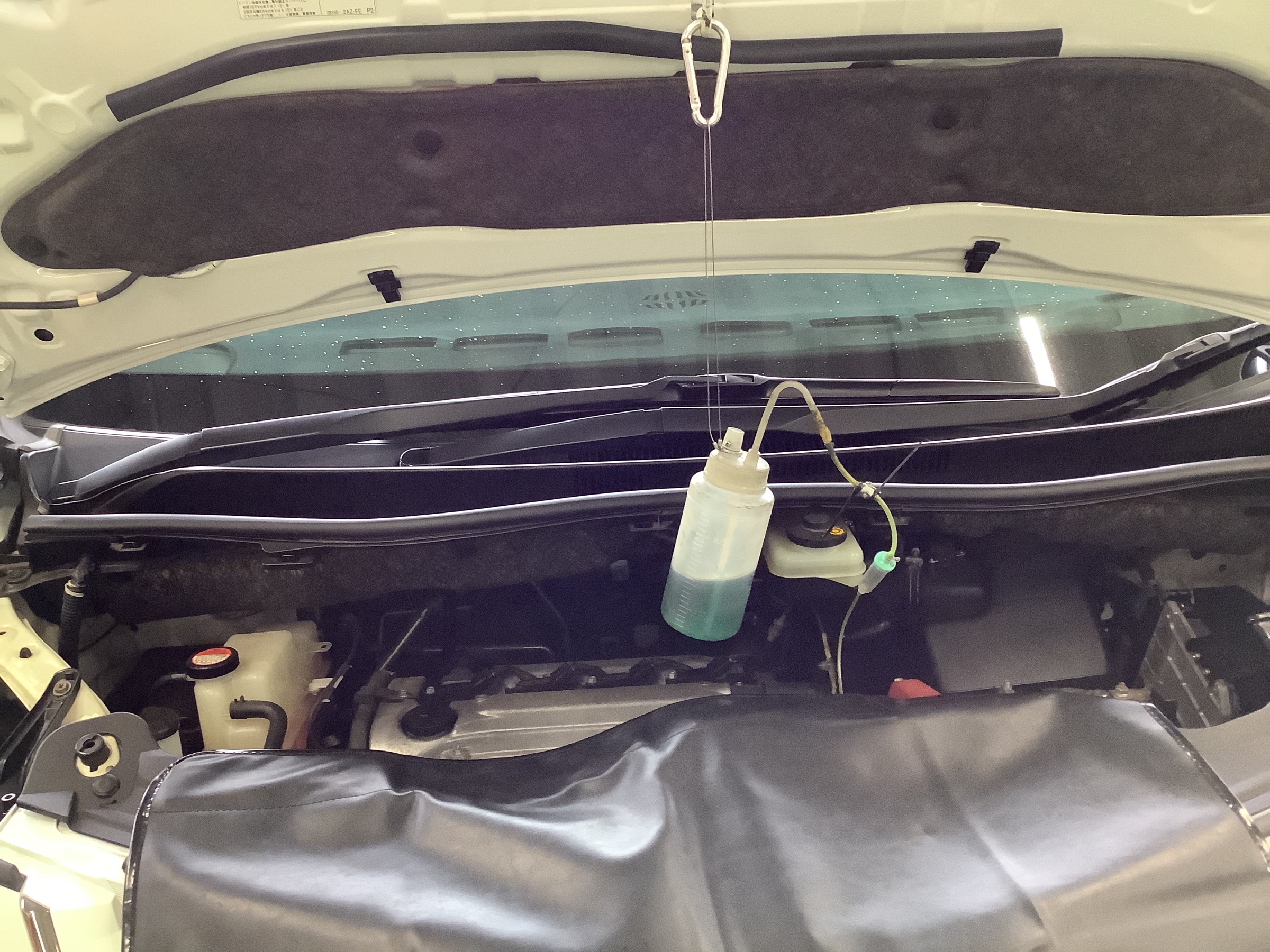 チューブを差し込んだらボンネットのフックに液剤をかけて放置します。