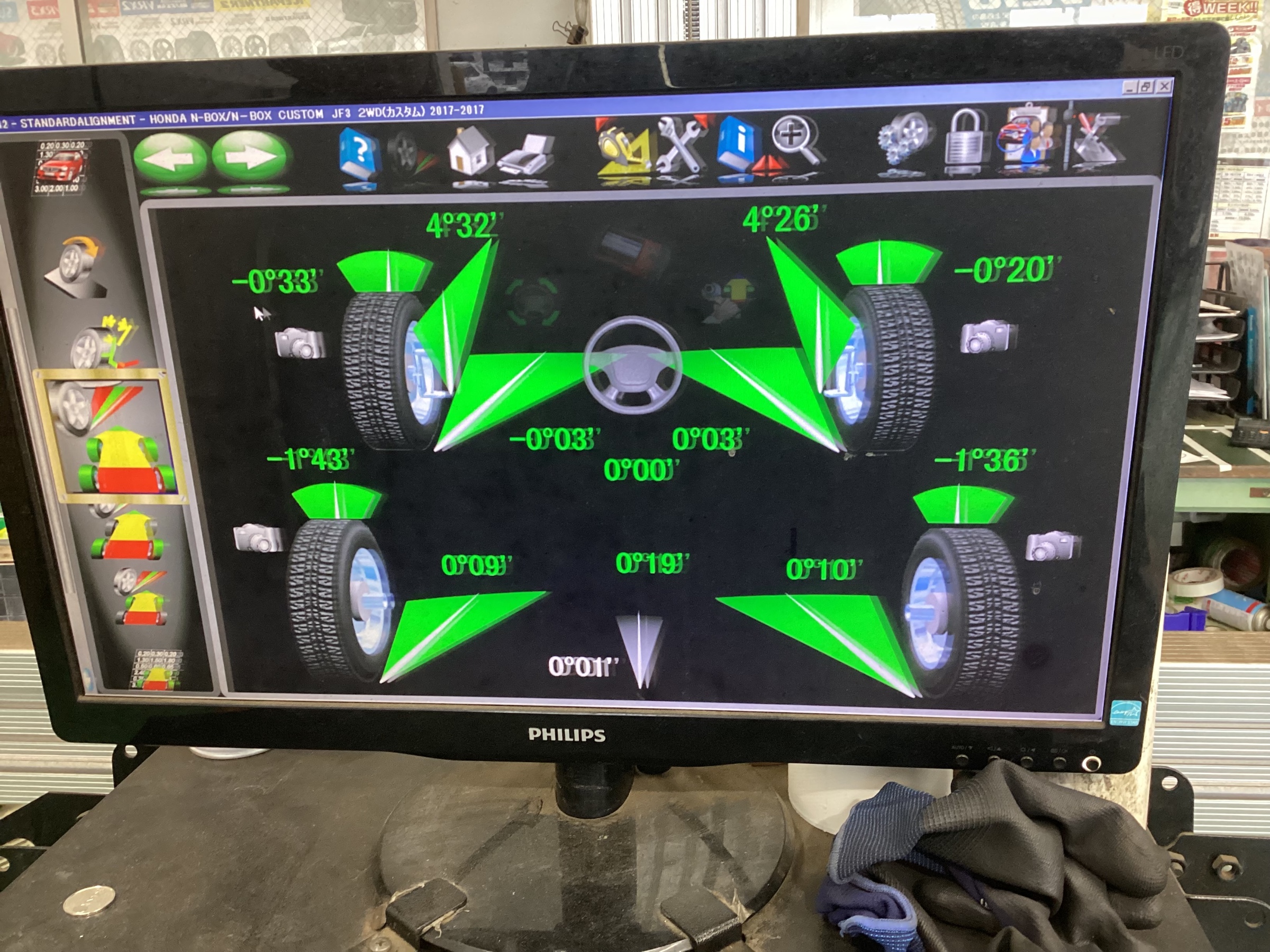 タイヤ館では、ホンダ車を含む様々な車種のアライメント調整作業を行っています。