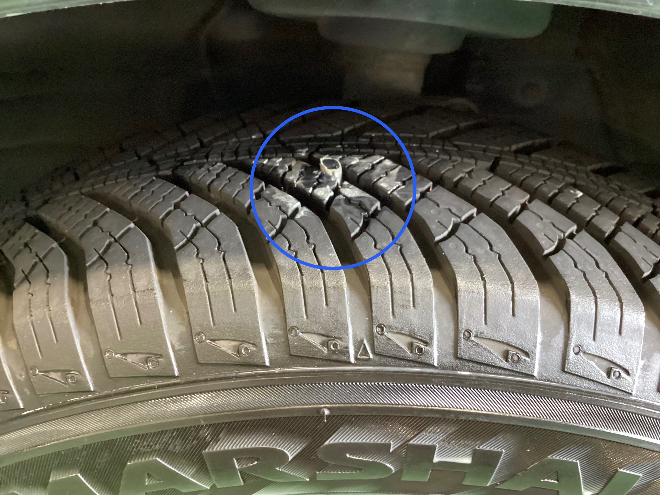 タイヤの内部損傷がなく少し斜めに刺さっていたため、