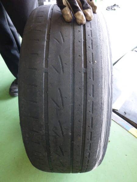 この状態で走行をすると、当然溝がないので濡れた路面で停まりにくくなりますし、