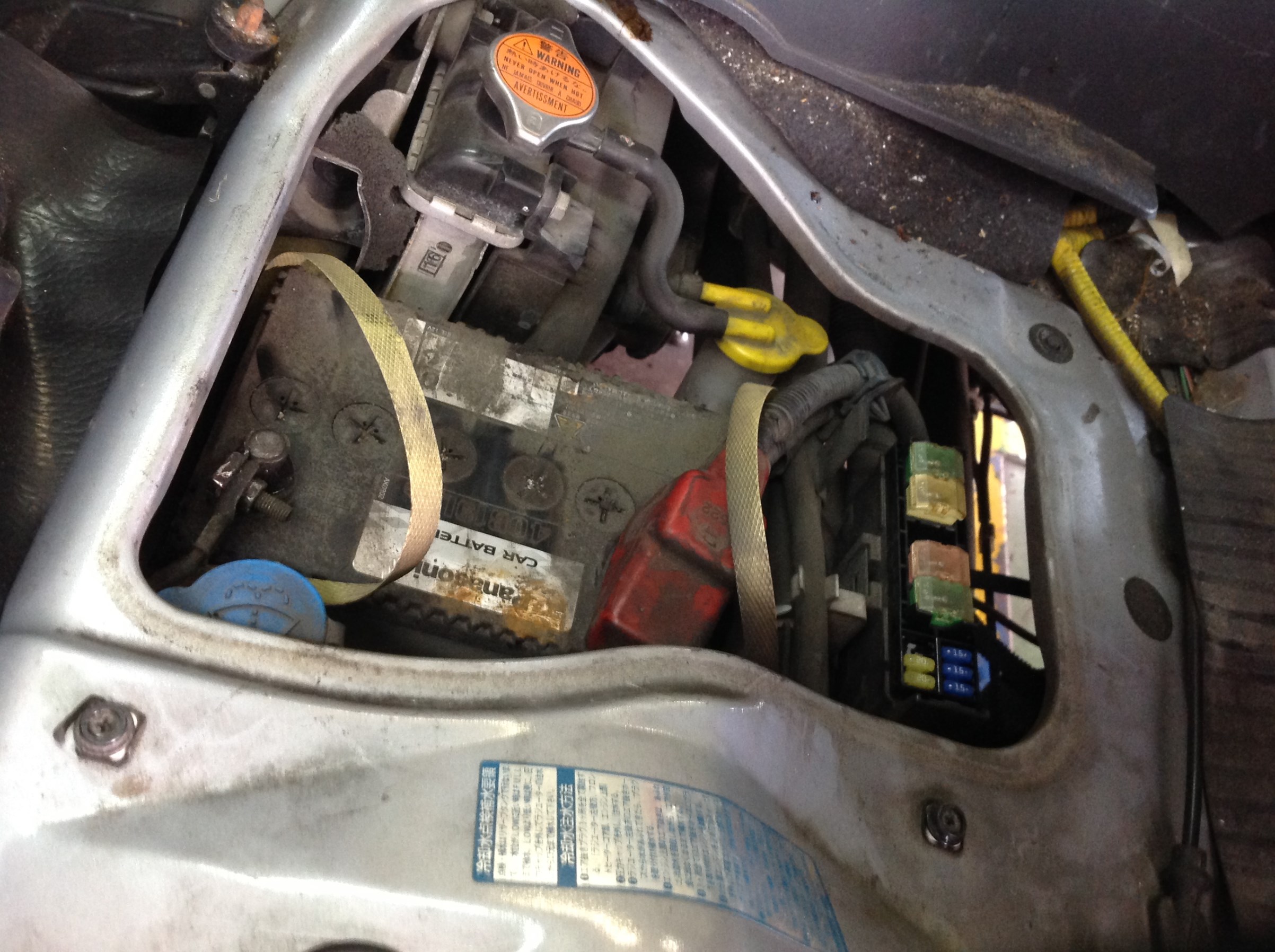 サンバーのバッテリーは助手席の下…パカッと座席を持ち上げると、「コンニチハ!」します。