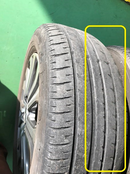 このようなミニバンは重心が高いので、普通タイヤの外側が減りやすいのですが、この車はなぜかタイヤの内側が減っていました。
