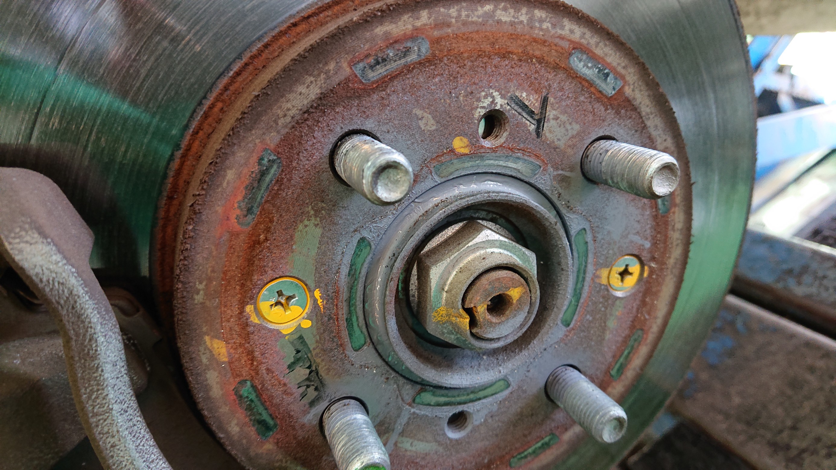 タイヤホイールを外した先に見える、ホイールハブ。施工後の写真は撮ってませんが、ここの錆落としと防錆施工も同時に行ってます。普段は見えない部分ですが、これでしっかり装着!