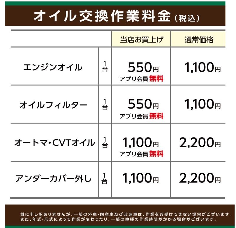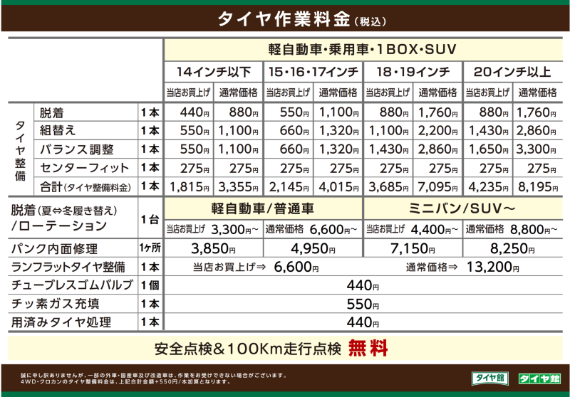 ミニバン・輸入車6.600円~(タイヤ館以外での購入品は13.200円~)/1台