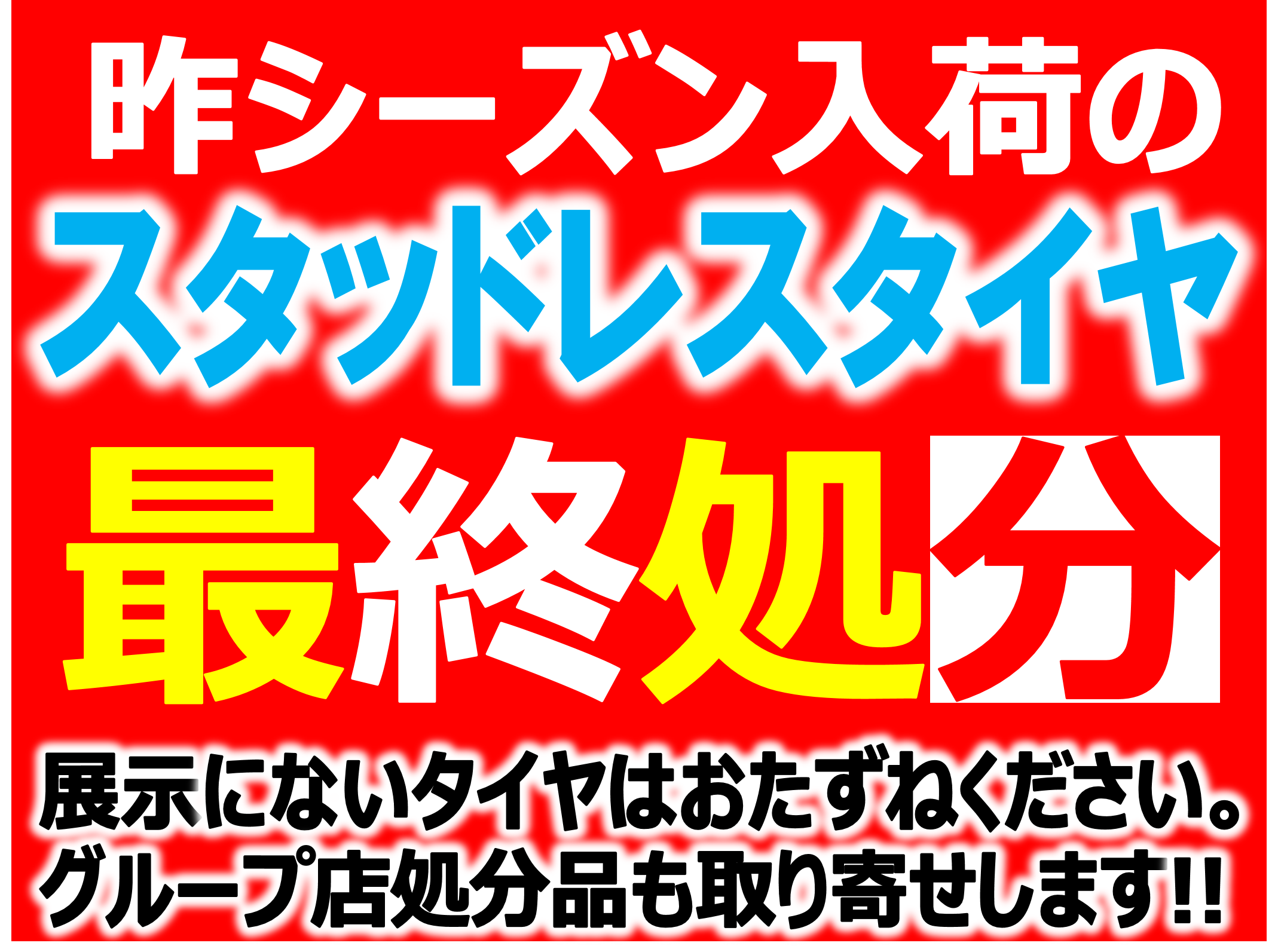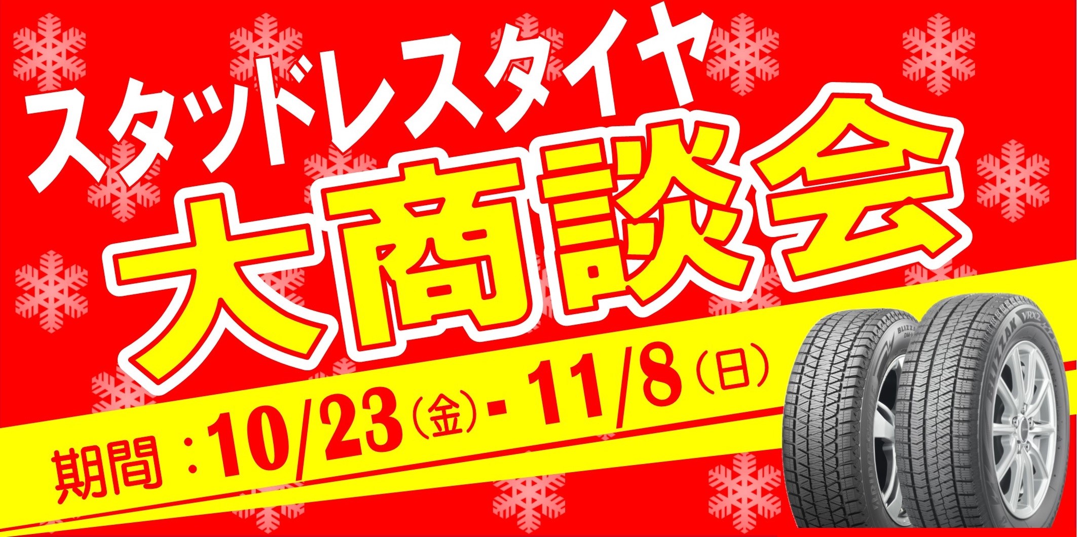 スタッドレスタイヤ大商談会 明日から開催!! ポスト 2020年10月22日 タイヤ館西神戸店のHPをご覧いただき ありがとうございます!! 10/23~11/08まで スタッドレスタイヤ大商談会を 開催します!!(^^♪ 更に!! あなたの愛車のタイヤがお得に見つかるかもしれません!! いよいよ明日からスタート!! この機会を是非お見逃しなく!! タイヤ館 西神戸←地図情報はこちらをクリック 〒651-2124 兵庫県神戸市西区伊川谷町潤和850-1 TEL 078-975-0410 営業時間 10:30-19:00 定休日 火曜日