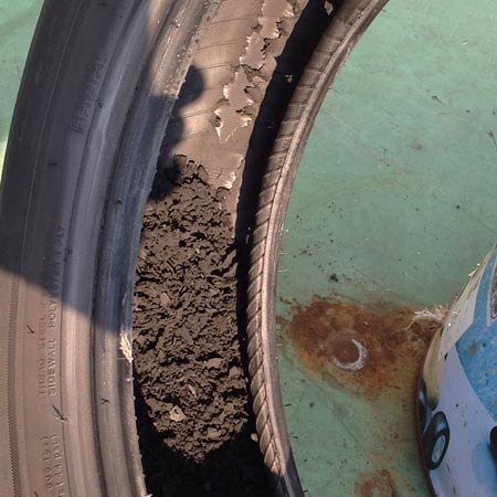 タイヤの内部をチェックするとご覧の通りボロボロ。再使用は危険すぎて不可能な状態でした。