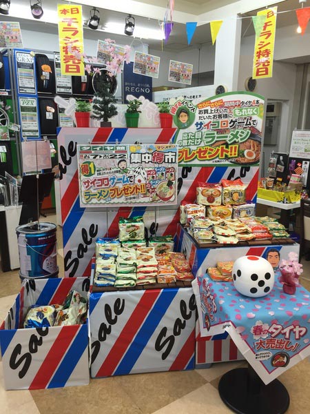 タイヤ4本お買い上げで出た目の数だけ袋麺プレゼント中!