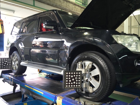 パジェロのタイヤ交換とアライメント調整でございます!