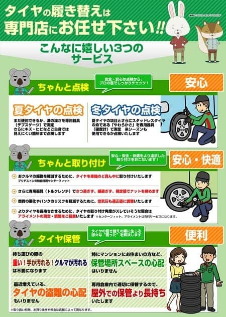 タイヤ館では脱着作業も拘りたっぷりの安心・安全メニューを