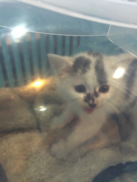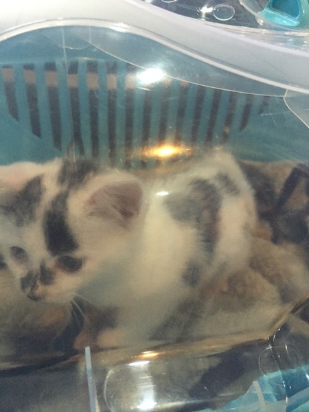 おそらく生後1か月半ぐらいかな!?白いモコモコの毛並がかわいい子猫ちゃんです。