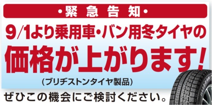 ブリヂストン乗用車用スタッドレスタイヤは9月から値上がりいたします。
