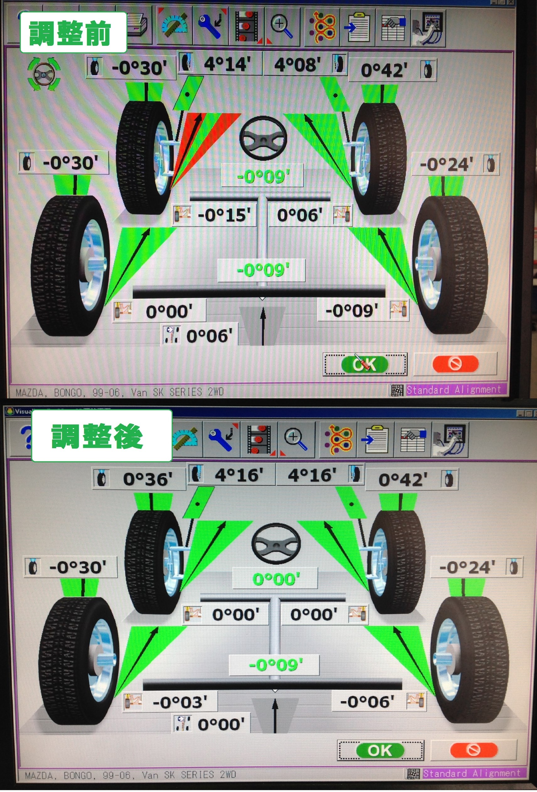 本日のはお仕事で使用中のボンゴにアライメント調整を実施させて頂きました。