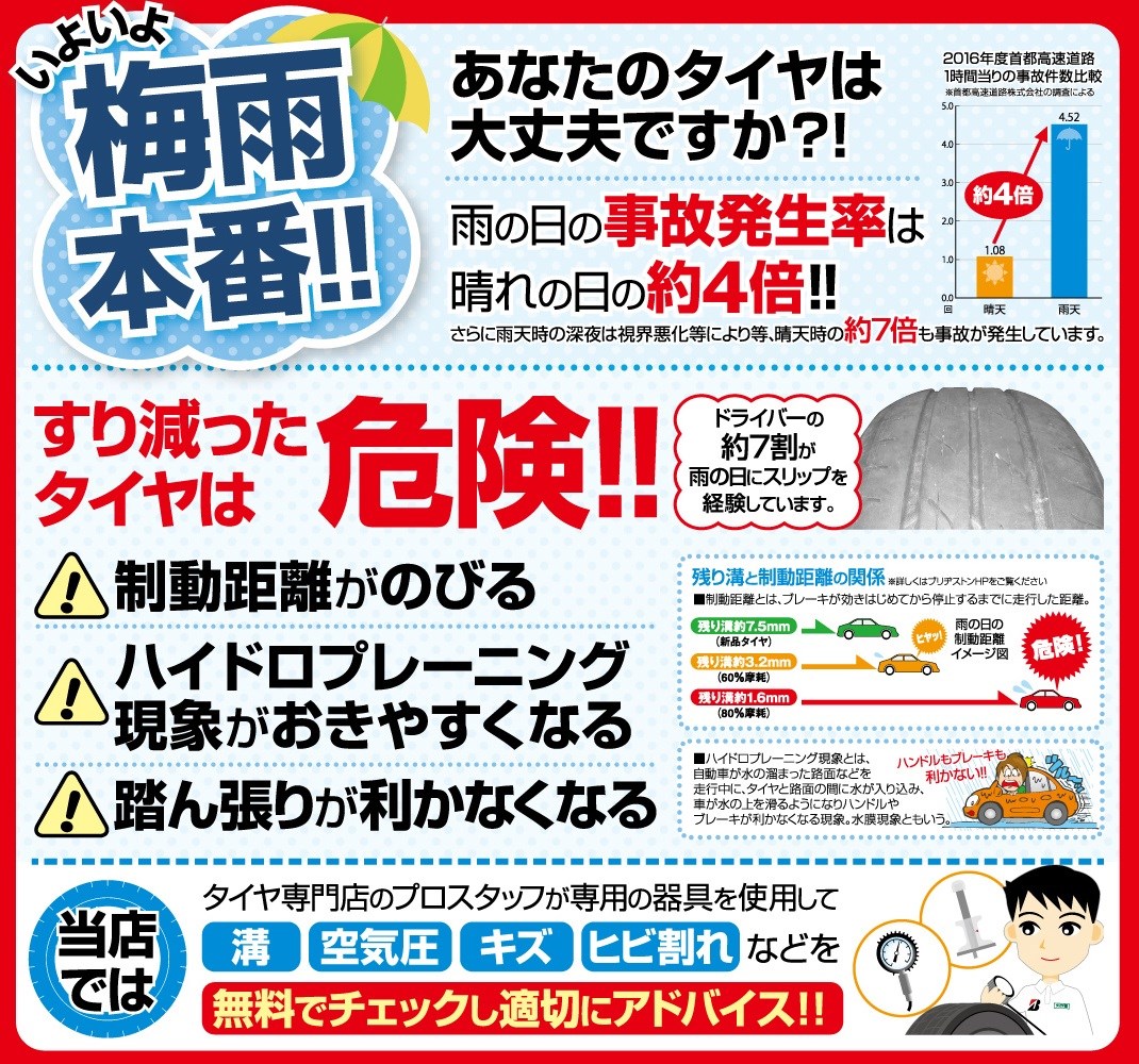 すり減ったタイヤは、制動距離がのびて踏ん張りが利かなくなり危険です。