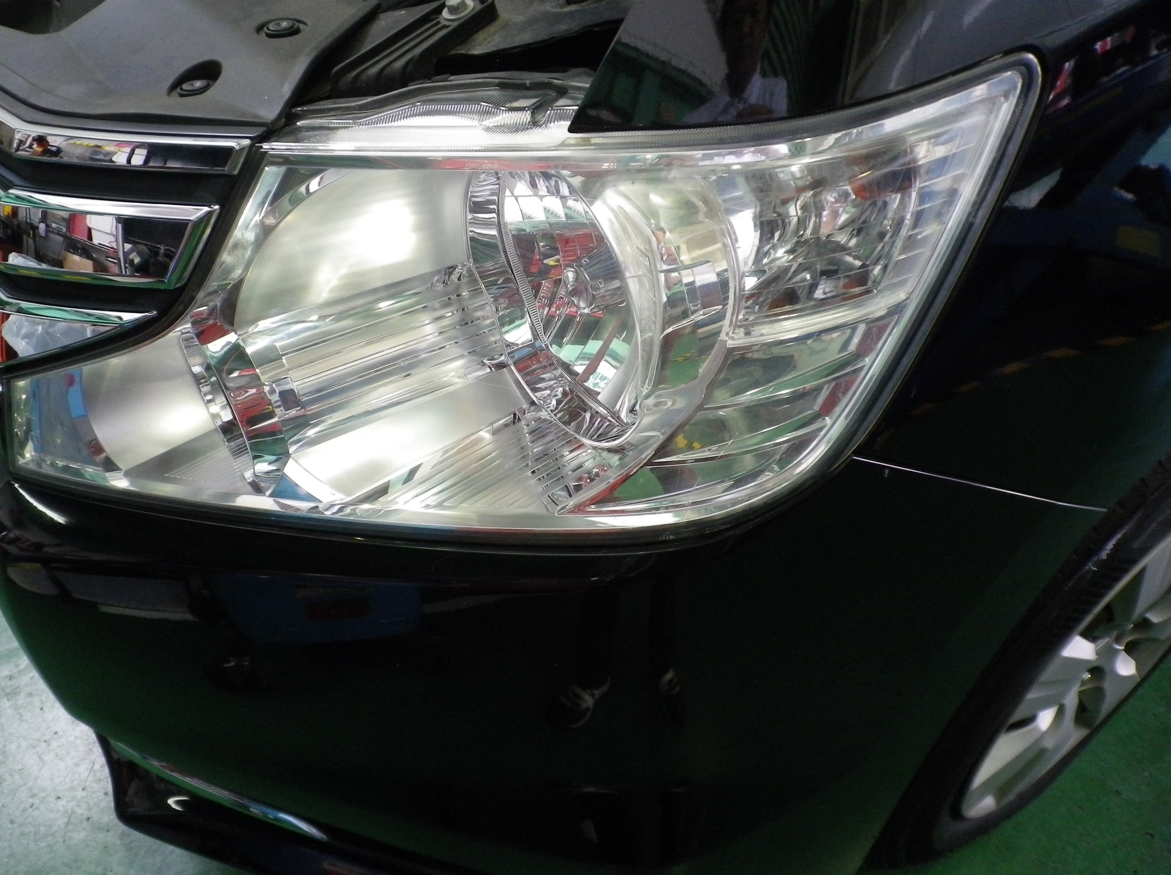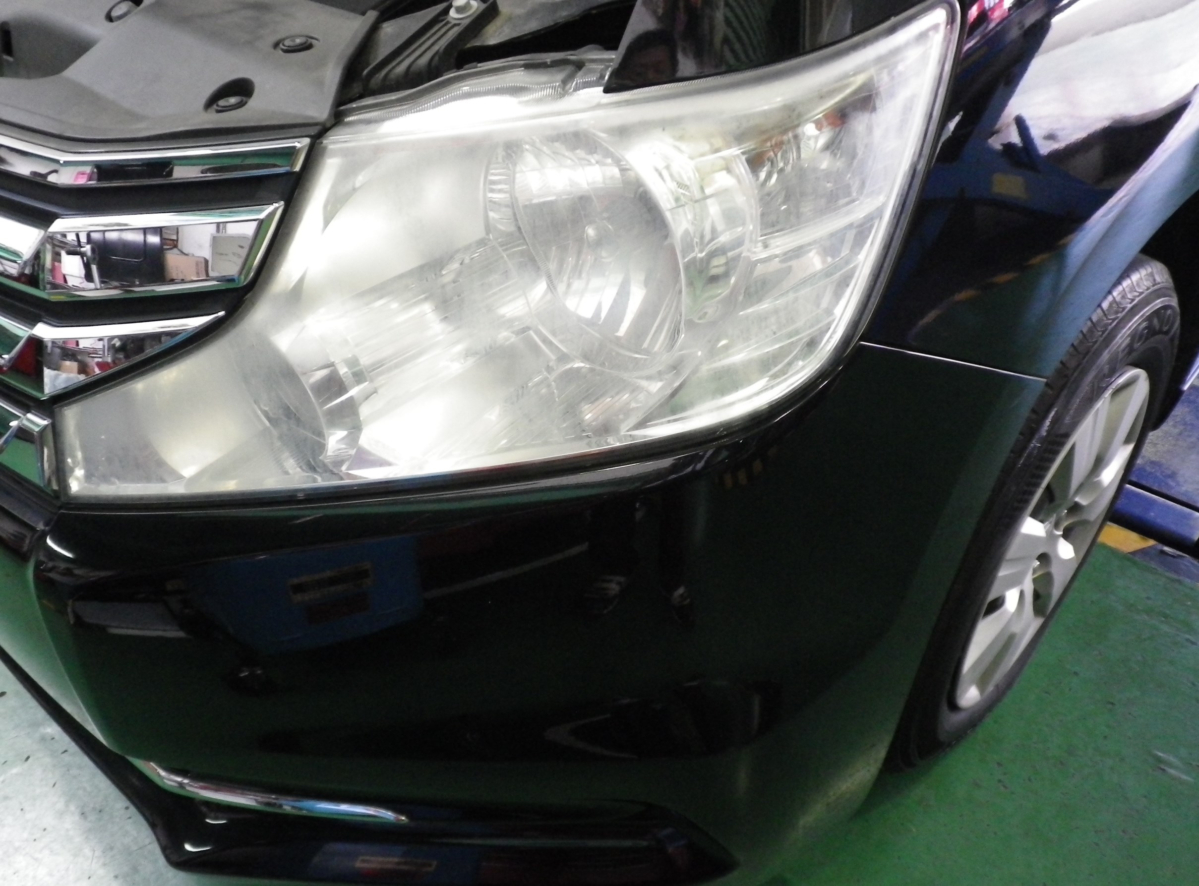 少し斜めからヘッドライトを見ると、表面のクスミで内側まで曇って見えていますね。。