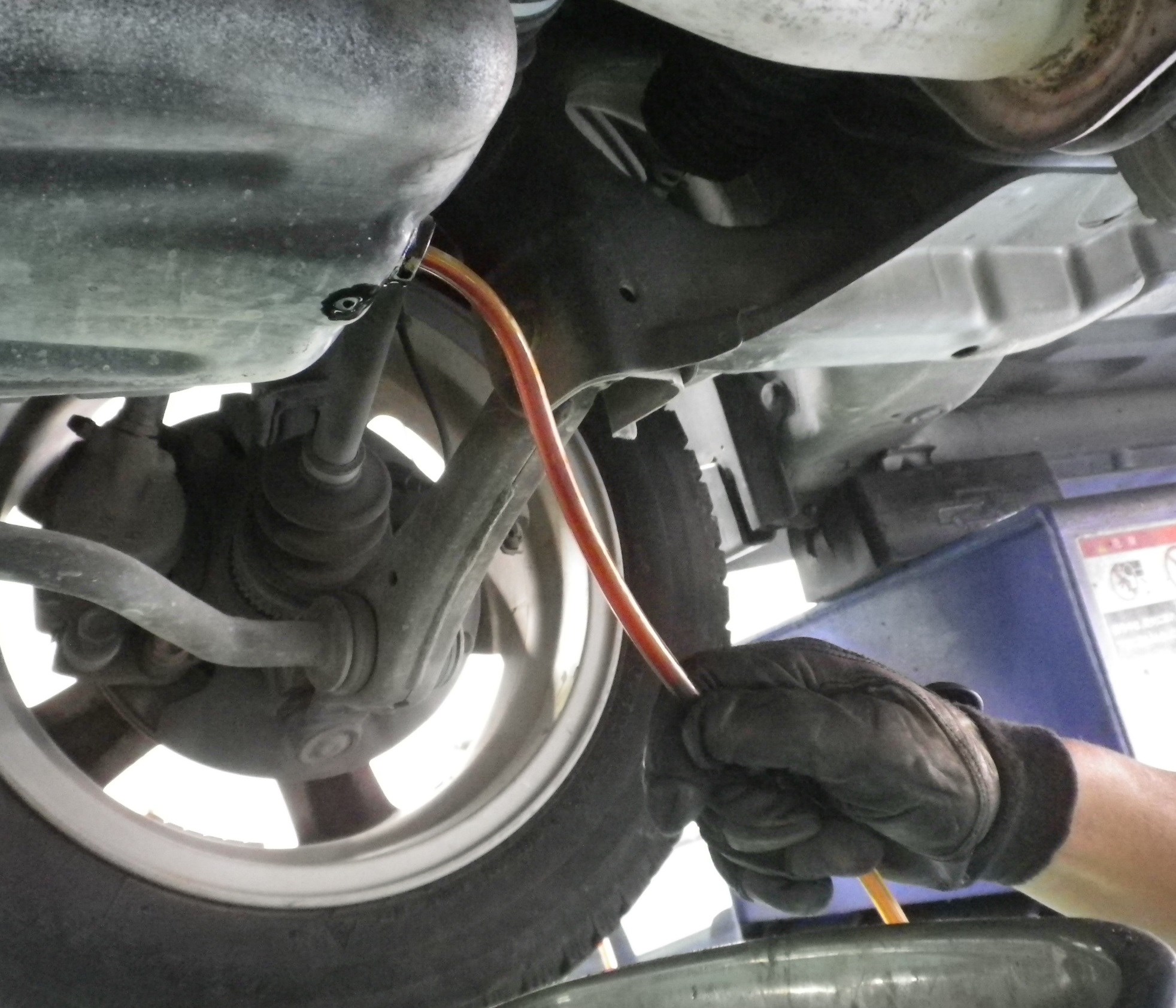 この『オイルブリーダー』にエアーホースを接続し、ノズルの先をドレンボルトを緩めたところより、オイルパンの内部に挿入すると、この様な感じで・・・