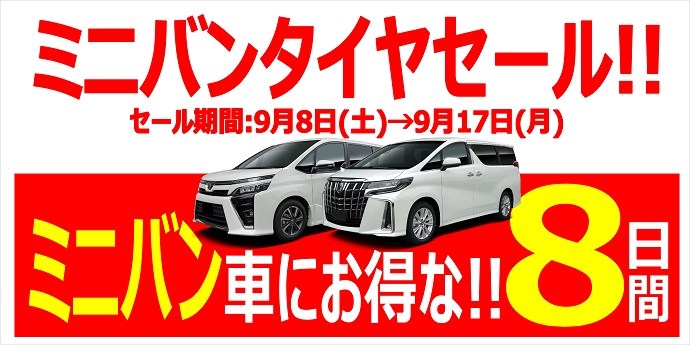 9月8日(土曜)から9月17日(月曜)までは『ミニバンタイヤSALE!!』開催で、ミニバンにお乗りのお客様には、とってもお得な8日間となっております。