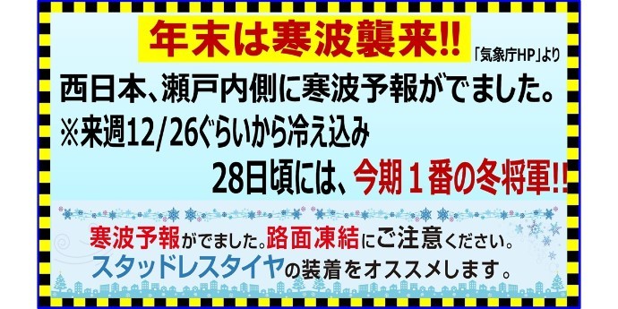 年末年始の寒波でお困りがいないよう31日営業します。 ポスト 2018年12月25日 タイヤ館西神戸店では年末年始の寒波予想に対し、 急きょ!!31日も営業する事になりました! 急なお困りごとなど少しでも応援出来たらと思います。 ので・・・年内無休で頑張ります!! 尚、31日の営業時間は 10:00~18:00 になりますのでご注意ください。 タイヤ館西神戸店へ皆様のご来店お待ちしてます! カテゴリ:お知らせ