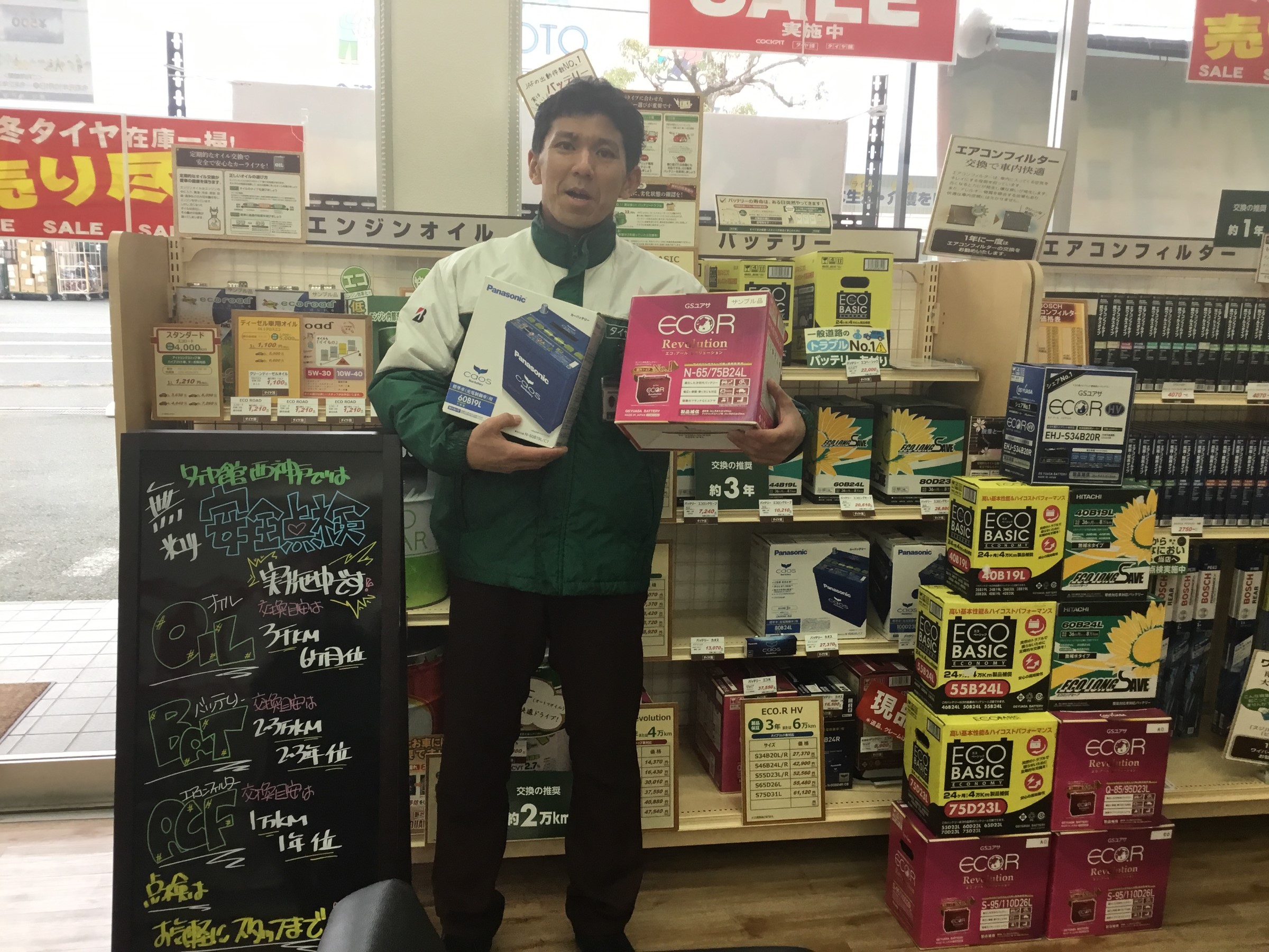 バッテリー の点検は無料で行っております、タイヤ館西神戸は