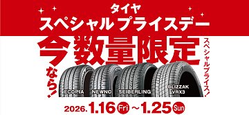 【2025年12月28日迄】スペシャルプライスデー開催!! タイヤ交換を検討中の方必見! 2025年12月19日(金)から12月28日(日)までの期間限定で、 一部商品がお買い得になるキャンペーンを実施中です!! 夏タイヤ・冬タイヤの交換を検討されている方は、この機会をお見逃しなく! キャンペーン概要...
