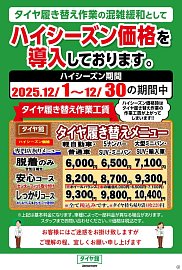 いつもご利用いただき、有難う御座います タイヤ館 西神戸です この度 タイヤ館では、タイヤ交換繁忙期の混雑緩和としまして タイヤ交換工賃のハイシーズン価格を導入致します。 期間は 12月1日〜12月30日 までとなっております。 ※ハイシーズン期間中は、通常のタイヤ交換工賃より値上がりしてます...