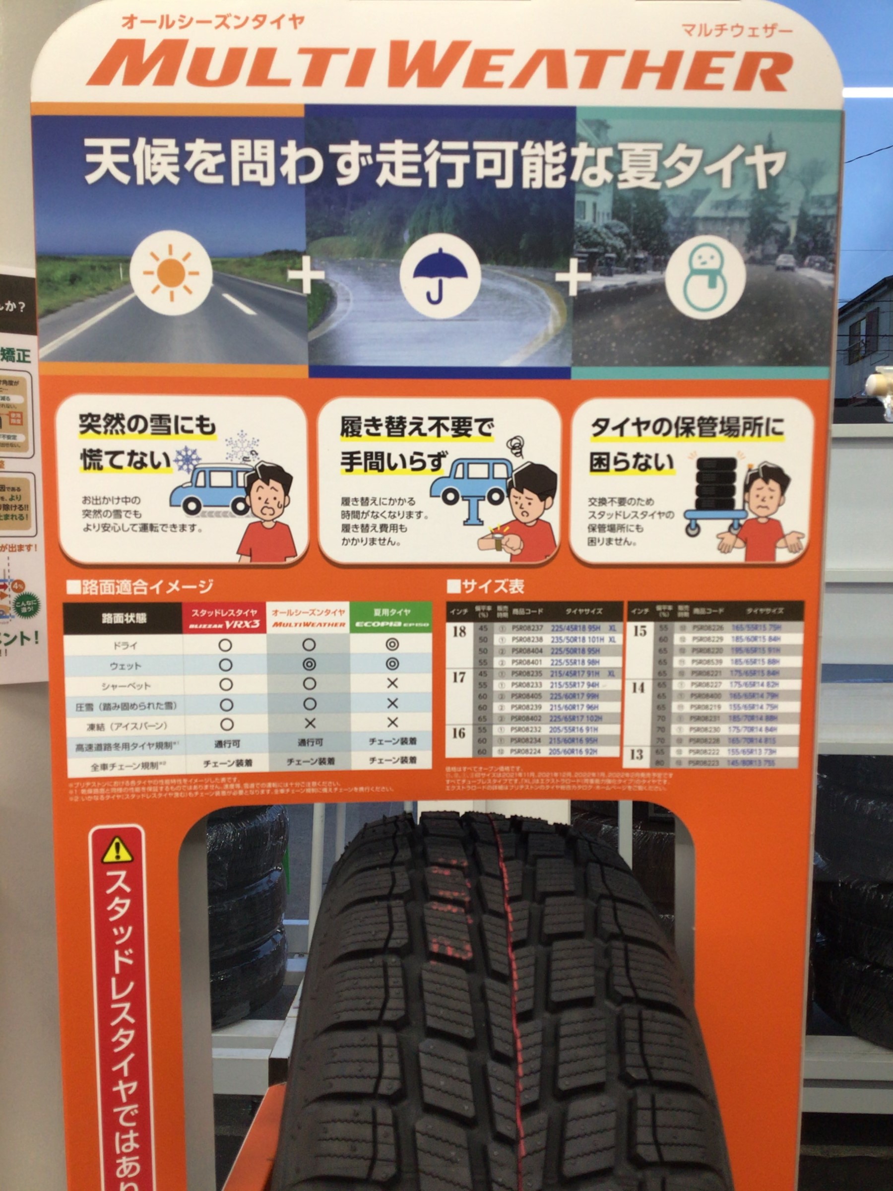 ブリヂストンのオールシーズンタイヤ ポスト 天候を問わず走行可能な夏タイヤ ブリヂストン初のオールシーズンタイヤ『マルチウェザー』発売!!! ・突然の雪にも慌てない ・履き替え不要で手間いらず ・タイヤの保管場所に困らない ・高速道路冬用タイヤ規制 通行可 ※シャーベットや圧雪路面に適合していますが 凍結路面(アイスバーン)には適合しておりません。 詳しくは店舗スタッフまで!!! カテゴリ:商品情報 タイヤ関連