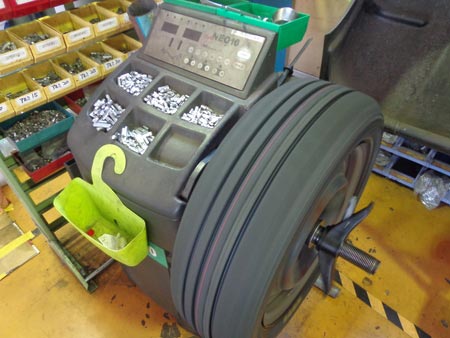 タイヤをはめた直後にバランス機にタイヤ付ホイールをつけ、まわし、傾いてないかチェックします。バランスが悪ければ悪い方にウェイトをつけ、まっすぐ回るように調整します。これがバランス調整です。
